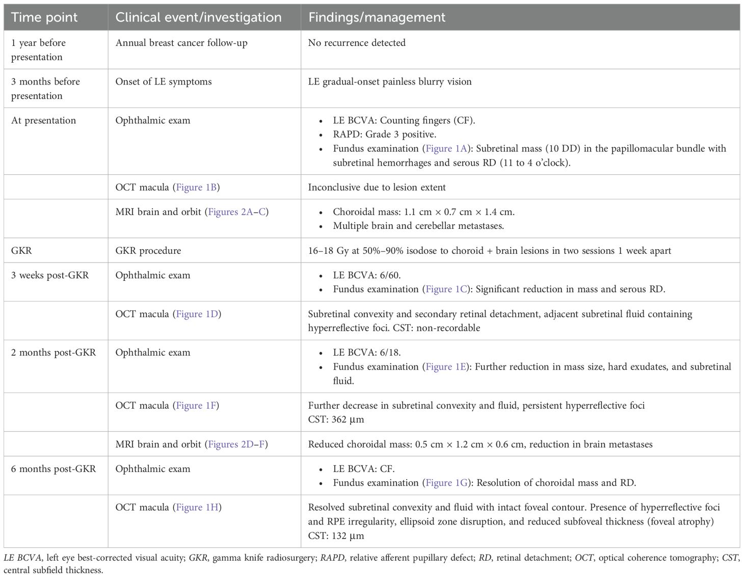 In conclusion, GKR is an effective, noninvasive alternative for the management of choroidal metastasis, particularly in cases where conventional treatments such as plaque brachytherapy or EBRT are unsuitable. While our case demonstrates excellent tumor regression and resolution of retinal detachment with GKR, the long-term visual outcomes are suboptimal due to foveal atrophy likely secondary to prior disease activity or radiation treatment and are largely dependent on the tumor location. Our case has also reinforced its value in the management of complex metastatic scenarios involving both choroidal and brain lesions while underscoring the need for ongoing visual monitoring. Further studies with larger cohorts and longer follow-up periods are needed to fully define the role of GKR in ocular metastasis and to establish standardized protocols for its use.