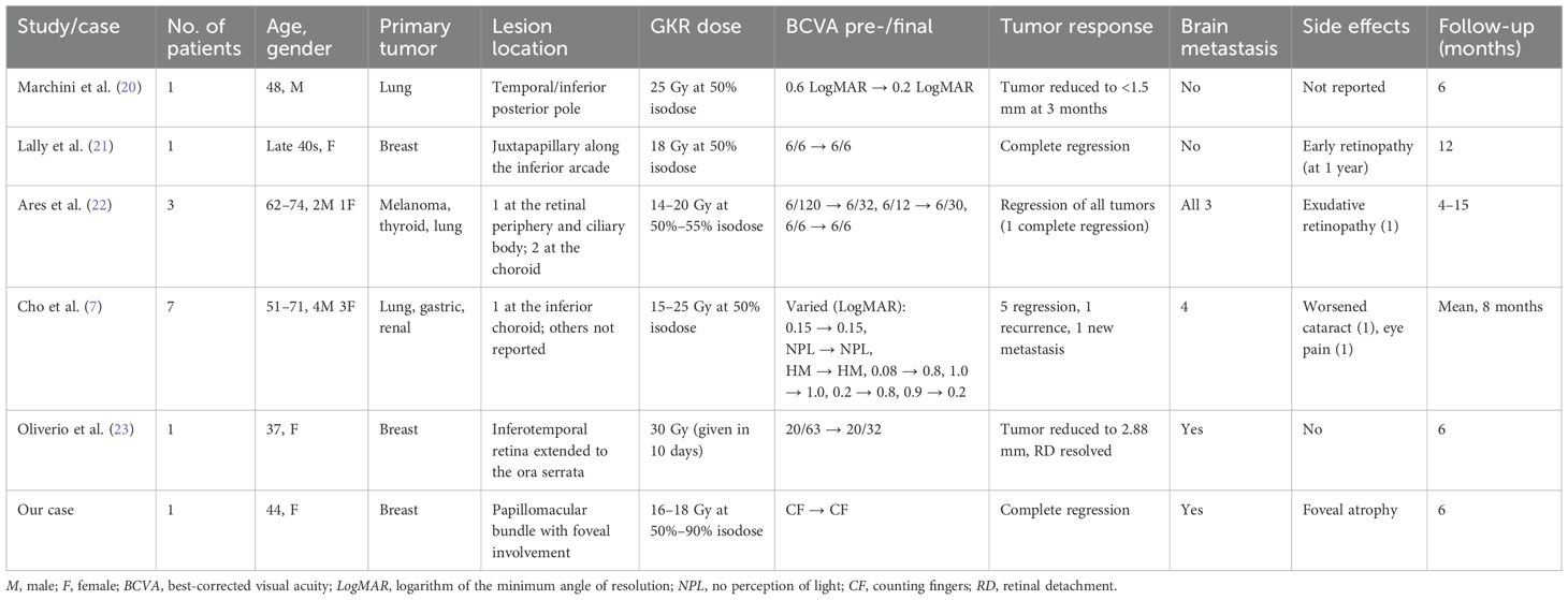 Table 2. Summary of case studies reporting on the use of gamma knife radiosurgery (GKR) in choroidal metastasis.