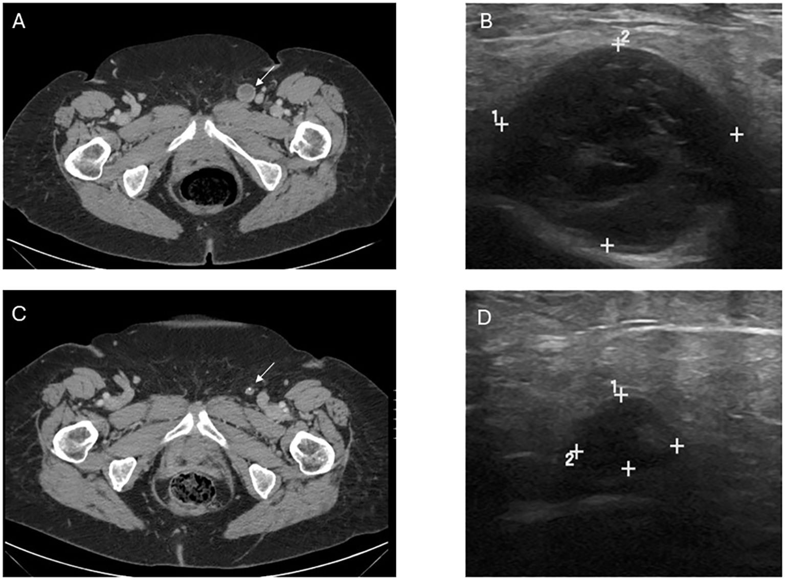 Figure 1. Image findings before and after T-VEC treatment. (A) Computed tomography (CT) demonstrating the abnormal lymph node consistent with metastatic melanoma prior to treatment. (B) Pretreatment ultrasound showing the enlarged, hypoechoic lymph node in the left inguinal region corresponding with the CT finding and measuring 2.3 x 2.1 x 2.7 cm. (C) Post-treatment CT demonstrating decrease in size and near resolution of lymph node, in which fine needle aspiration was unable to retrieve any viable melanoma. (D) Post-treatment US with significant decrease in size, measuring 1.2 x 0.5 x 0.7 cm though with some persistent abnormal morphology. Post-treatment size and morphology remained stable on axial and sonographic imaging after treatment discontinuation.