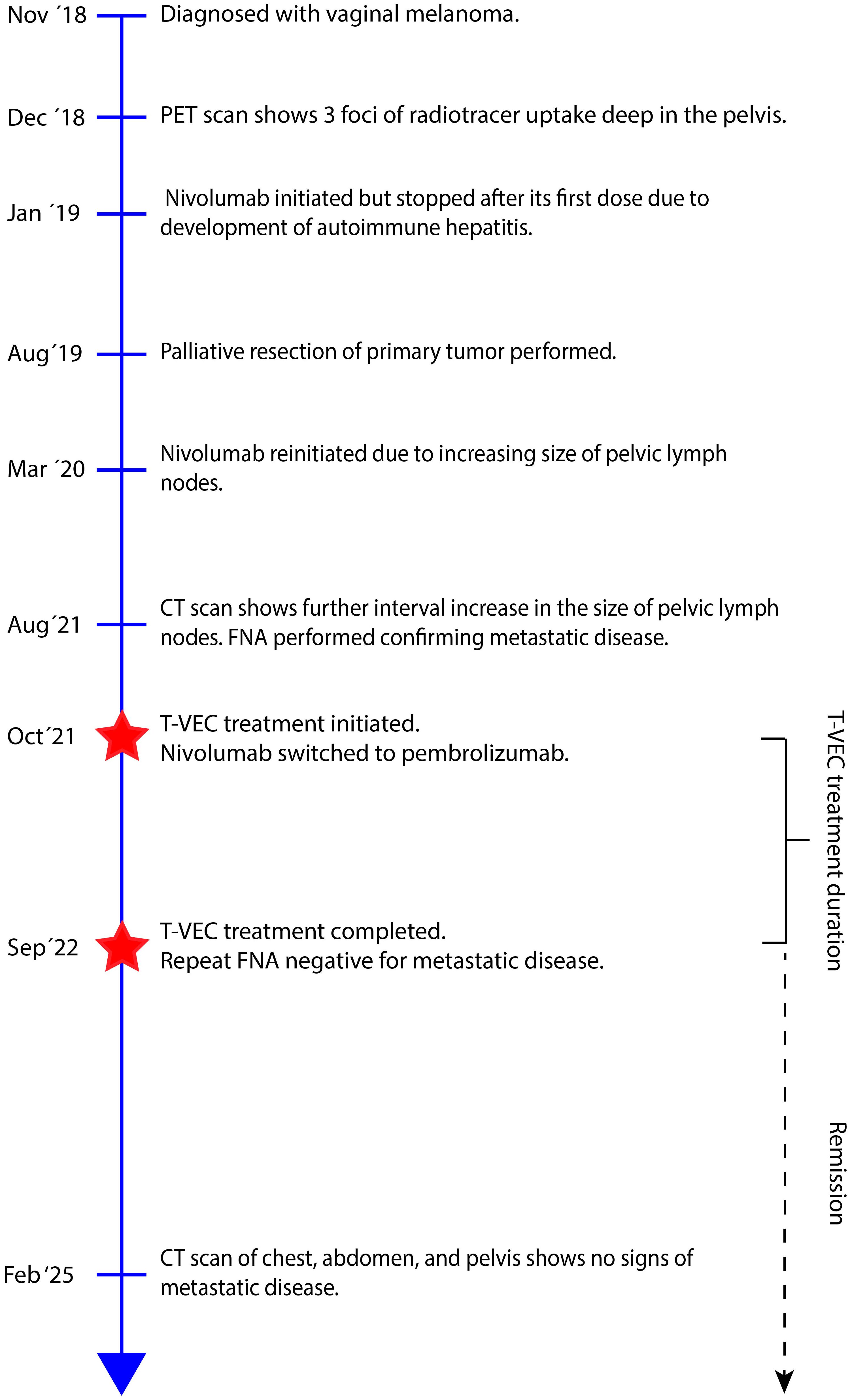 She was started on immunotherapy with immune checkpoint inhibition (ICI) with nivolumab that was complicated by development of autoimmune hepatitis after its first dose in January 2019. This was treated with a steroid taper. She was offered pelvic exenteration but ultimately opted against such extensive surgery. In the following months, she developed worsening vaginal bleeding, causing significant lifestyle limitations, and she underwent palliative resection with R1 resection margins. Months later, her lymph nodes were noted to be enlarged and nivolumab therapy was restarted with palliative intent to maximize quality of life as patient was not amenable to extensive pelvic exenteration. She initially had partial response to the treatment as defined by the Immune Response Evaluation Criteria in Solid Tumors (iRECIST), without signs of hepatitis recurrence. However, a repeat computed tomography (CT) scan in 2021 showed progression of her disease, with a left inguinal lymph node noted to have increased from 0.8 cm to 2.0 cm in size. She therefore underwent a fine needle aspiration (FNA) confirming the diagnosis of metastatic malignant melanoma. Options for locoregional control including both surgical lymphadenectomy and intralesional therapy were discussed with the patient. She strongly desired to avoid the morbidity of surgery and was subsequently started on intralesional injections of T-VEC to the metastatic lymph node. She received T-VEC injections every 3 weeks over a 12-month time period with a total of 17 treatments. The initial dose was administered as 1 mL of 10^6 plaque-forming units (PFU). Subsequent doses were all full strength at 10^8 PFU with volume adjusted based on ultrasound measurements of the size of lymph node (ranged from 0.5–2 mL). Concomitantly, she was switched to pembrolizumab therapy so she could receive her ICI and T-VEC administrations on the same day. Repeat FNA of the treated lymph nodes after the completion of her T-VEC treatment showed no signs of residual metastatic disease in the lymph node. She continued in surveillance with clinical examinations, initially with frequent nodal ultrasound to supplement her axial imaging. Maintenance Pembrolizumab therapy was continued at 6-week intervals thereafter for 10 months. Of note, biopsy of the inguinal lymph node was negative though ctDNA was low positive at 0.06 mean tumor molecules/mL. Her latest CT scan of the chest, abdomen, and pelvis 2.5 years after cessation of T-VEC treatment and 19 months after discontinuing ICI did not show any signs of metastatic disease (Figure 1). A timeline of her clinical course is reported in Figure 2.