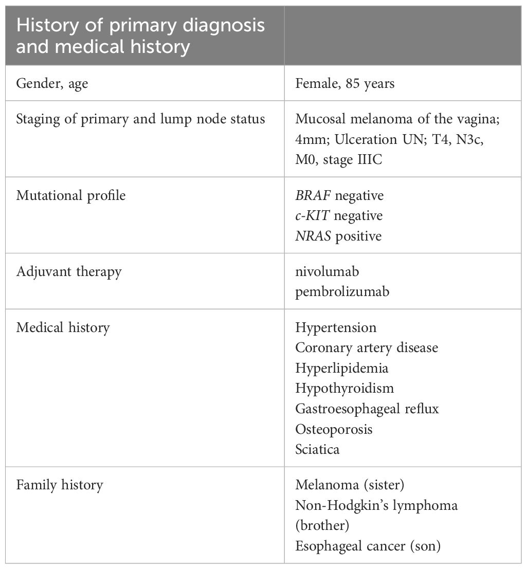 The patient is an 85-year-old female with past medical history of hypertension, coronary artery disease, hyperlipidemia, hypothyroidism, gastroesophageal reflux, osteoporosis, and right-sided sciatica who had initially been diagnosed with vaginal mucosal melanoma in 2018 following new onset of postmenopausal bleeding (Table 1). She underwent a PET scan that showed 3 foci of radiotracer uptake deep in the pelvis. Exam was consistent with a primary bleeding mass and in transit disease making her initial stage at least Stage IIIC. Genomic testing demonstrated an NRAS Q61L mutation.