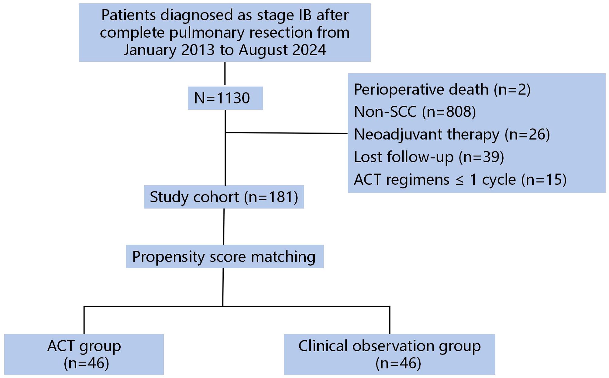 However, limited evidence exists regarding the efficacy of adjuvant treatment for stage IB pulmonary squamous cell carcinoma (SqCC). To address this knowledge gap, we conducted a real-world comparative study evaluating ACT versus observation in patients with completely resected stage IB SqCC.