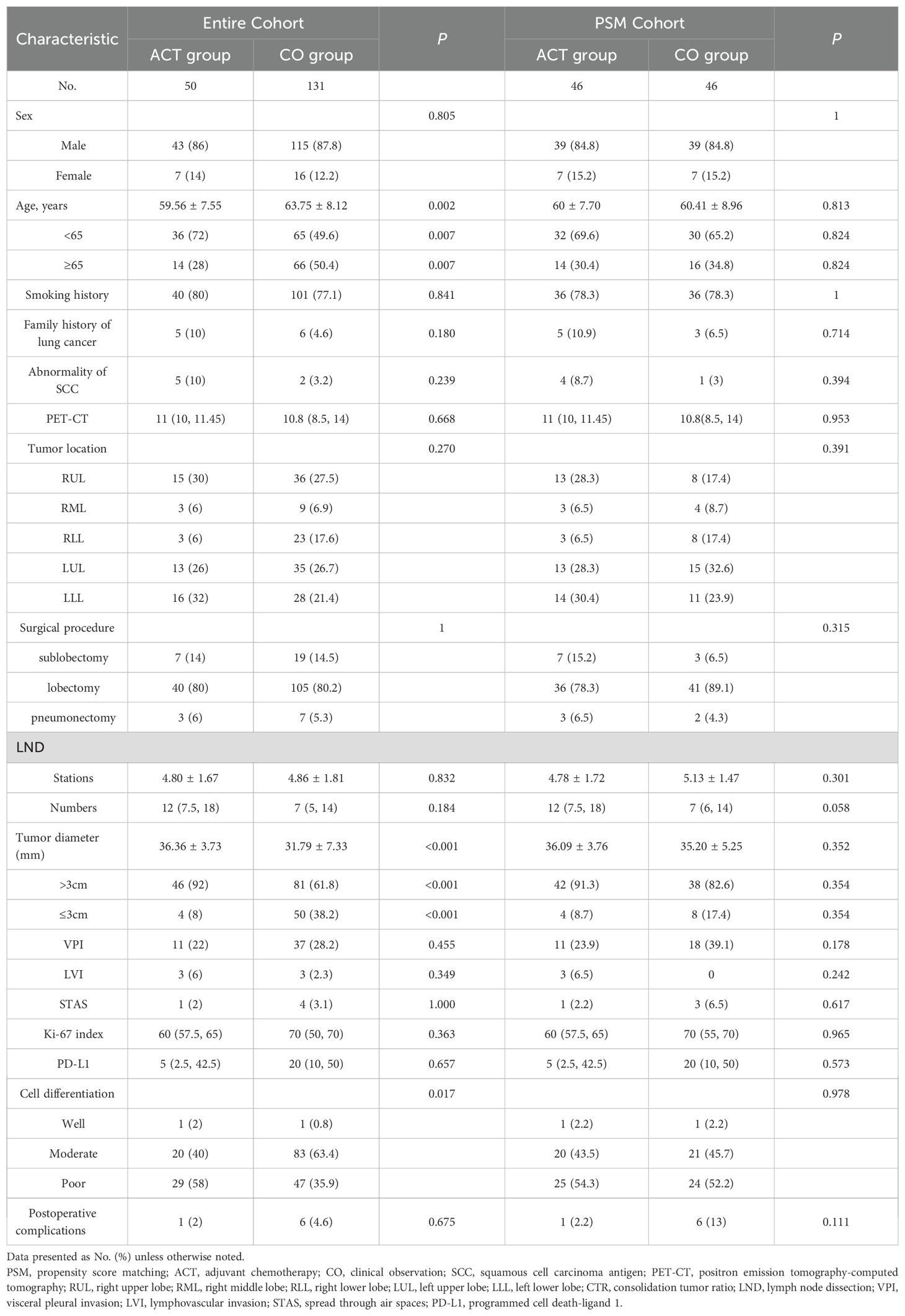 Results: A total of 181 patients were enrolled in the study. Among them, 50 patients (27.6%) received adjuvant chemotherapy (ACT), while 131 patients (72.4%) were assigned to the clinical observation (CO) group. The ACT group had more patients <65 years (P = 0.007), larger tumors (P < 0.001), and more poorly differentiated tumors (P = 0.017) compared with the CO group. The two groups were comparable after PSM. Among the ACT group, twenty-eight (56%) patients received cisplatin plus docetaxel regimen. 16% (8/50) of patients took cisplatin plus gemcitabine regimen, and carboplatin plus paclitaxel was 14 (28%) patients’ option. The median follow-up time was 60 months (range: 5–137 months). The 5-year DFS rates were 84.8% in the ACT group and 85.6% in the CO group (HR: 1.05, 95% CI 0.44-2.51; P = 0.919). There was no statistically significant difference in DFS between groups, both in the entire cohort (P = 0.701) and the matched cohort (P = 0.665). The 5-year OS rates were 96.8% in the ACT group and 93.1% in the CO group (HR: 2.46, 95% CI 0.72-8.35; P = 0.150). No statistically significant difference in OS was observed, either in the overall cohort (P = 0.131) or in the matched cohort (P = 0.300).