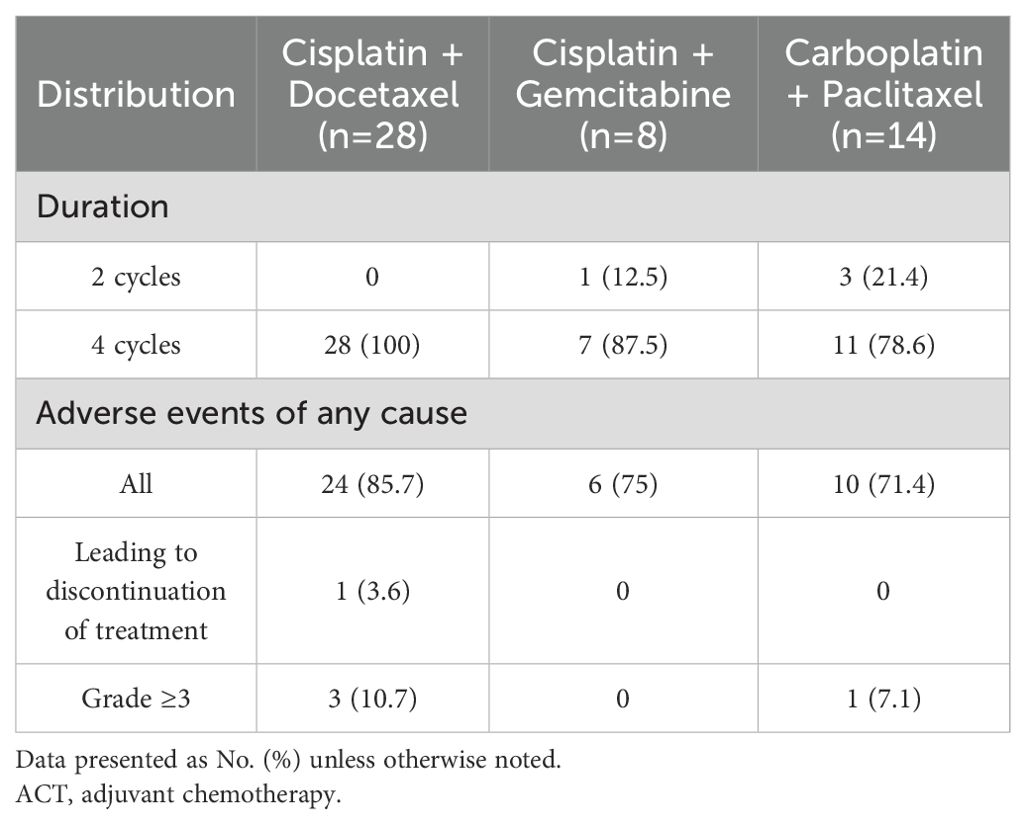 The ACT cohort demonstrated distinct preferences in chemotherapy regimen selection, with cisplatin-docetaxel emerging as the most frequently prescribed combination (56%, n=28) (Table 2). Alternative regimens included cisplatin-gemcitabine (16%, n=8) and carboplatin-paclitaxel (28%, n=14). Notably, regimen completion rates varied substantially, with cisplatin-docetaxel achieving perfect adherence (100% completion) compared to 78.6% for carboplatin-paclitaxel. Treatment-related adverse events were common, affecting 80% (n=40) of ACT recipients. Toxicity profiles differed meaningfully across regimens: Cisplatin-gemcitabine demonstrated optimal tolerability with no grade ≥3 toxicities or treatment discontinuations, Carboplatin-paclitaxel showed intermediate toxicity but higher regimen incompletion rates, and Cisplatin-docetaxel, while having higher grade ≥3 events, maintained superior treatment completion. This pattern suggests that while platinum-doublet regimens exhibit class-effect toxicities, specific combinations may offer different risk-benefit profiles in the adjuvant setting for SqCC patients.