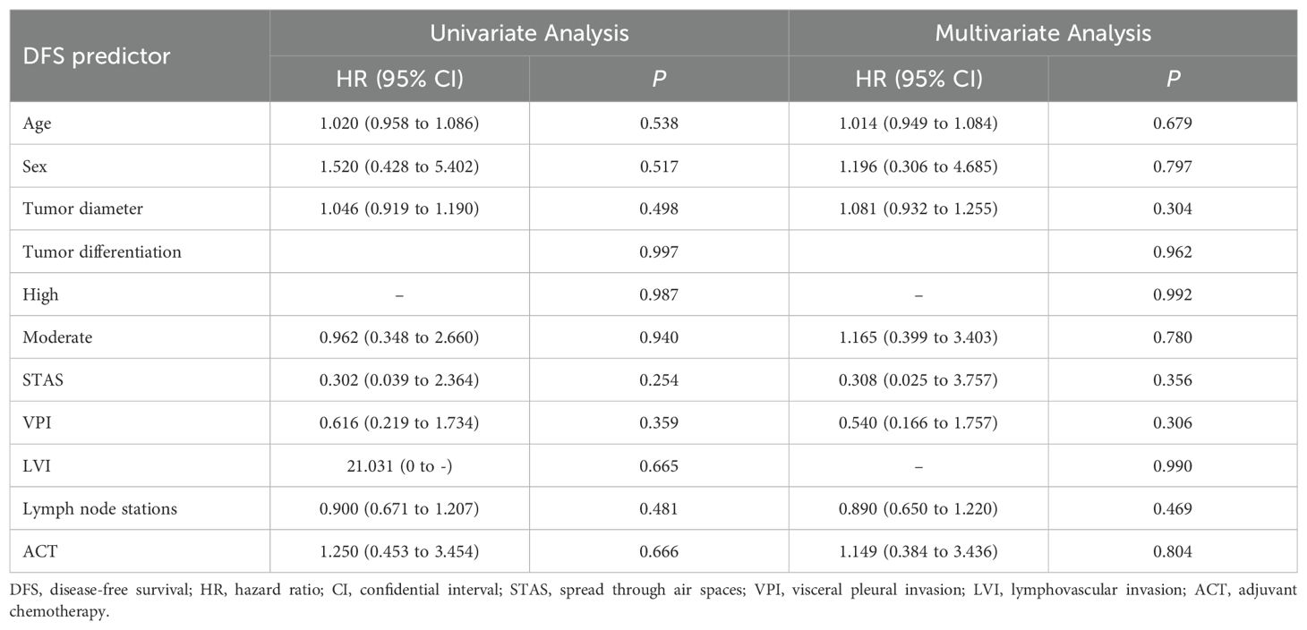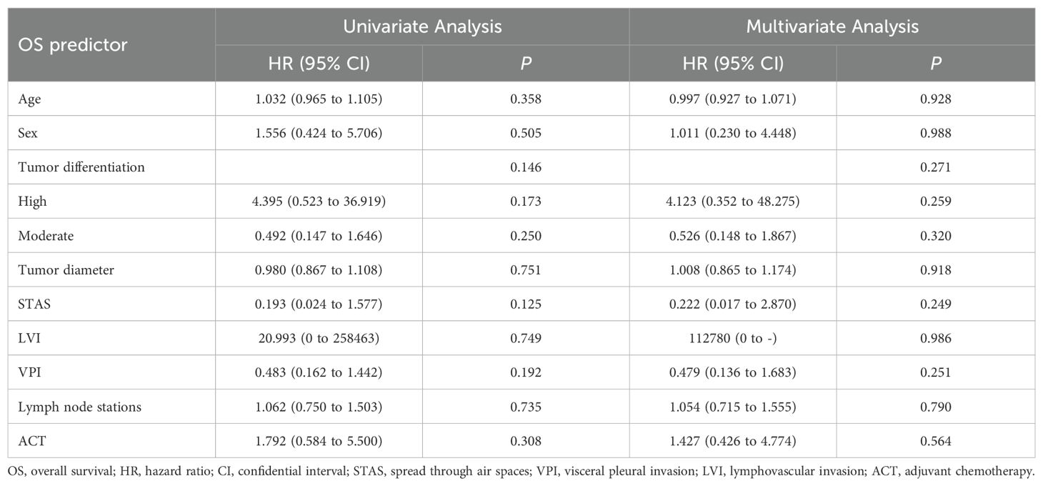 Univariate and subsequent multivariate analyses revealed that age, sex, tumor differentiation, tumor diameter, STAS, LVI, VPI, number of lymph node stations sampled, and ACT were not significantly associated with DFS (Table 3). Similarly, these factors did not demonstrate significant associations with OS in either univariate or multivariate analyses (Table 4).