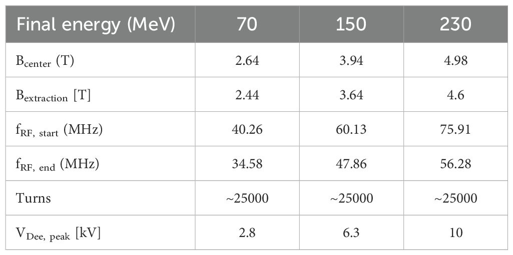 We give special consideration to the radiofrequency (RF) system, providing the accelerating force acting on the beam. In the synchrocyclotron, the frequency must decrease with time as the particles are accelerated to higher energies to compensate for the relativistic increase of inertia (see Equation 2). Consequently, after a short train of particle bunches has been accelerated and extracted, the process must begin anew with the frequency returning to the starting point and a new set of bunches injected from the ion source in the center of the cyclotron. Three exemplary sets of parameters for different final beam energies are listed in Table 1. We propose a state-of-the-art technique to accommodate this acceleration profile and the non-linear change of frequency with time during each cycle by using a solid-state, biased-ferrite tuner (45) combined with a wide-band RF amplifier and a computer-programmable Low-Level RF (LLRF) oscillator to allow agile frequency and voltage control, while still achieving the required pulse repetition rate of 1 kHz. This tuner is coupled with the RF cavity and adjusts its resonant frequency to match the beam revolution frequency in the magnetic field at all times.