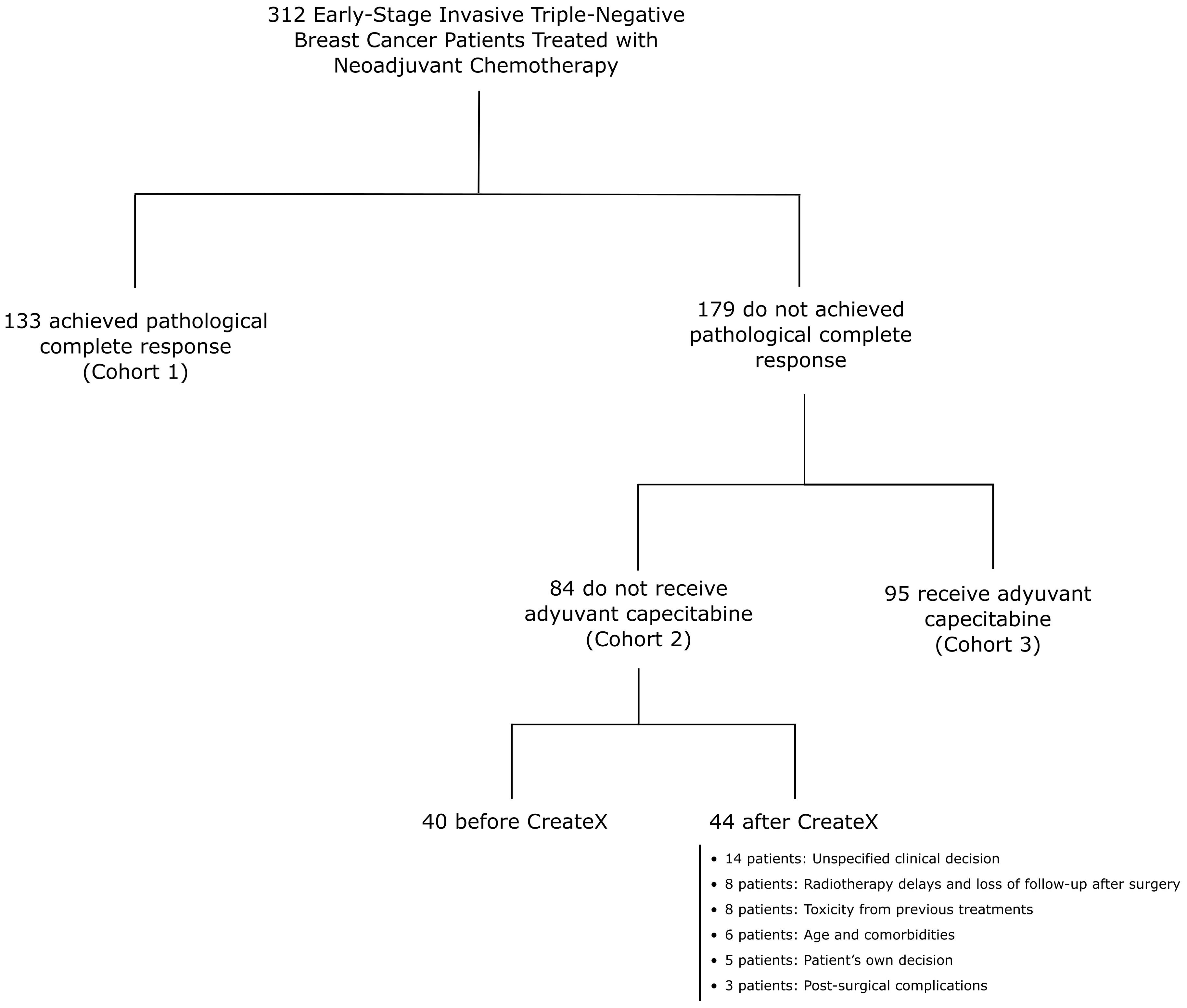 Flowchart depicting 312 early-stage invasive triple-negative breast cancer patients treated with neoadjuvant chemotherapy. 133 achieved pathological complete response (Cohort 1). 179 did not, split into 84 not receiving adjuvant capecitabine (Cohort 2) and 95 receiving it (Cohort 3). Cohort 2 is further divided into 40 before CreateX and 44 after. Reasons include clinical decisions, radiotherapy delays, toxicity, age, patient decision, and post-surgical complications.