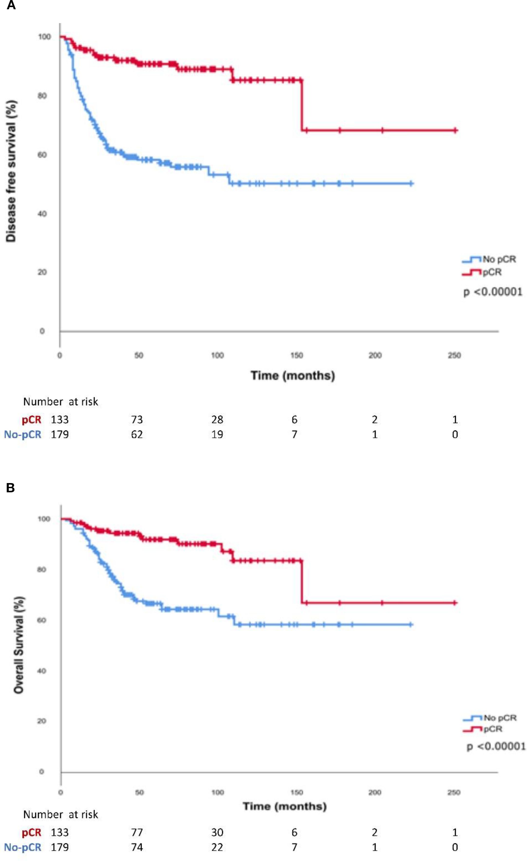 Figure 2. Kaplan-Meier curves of (A) Disease-free survival and (B) Overall survival according to pathological response after neoadjuvant treatment.