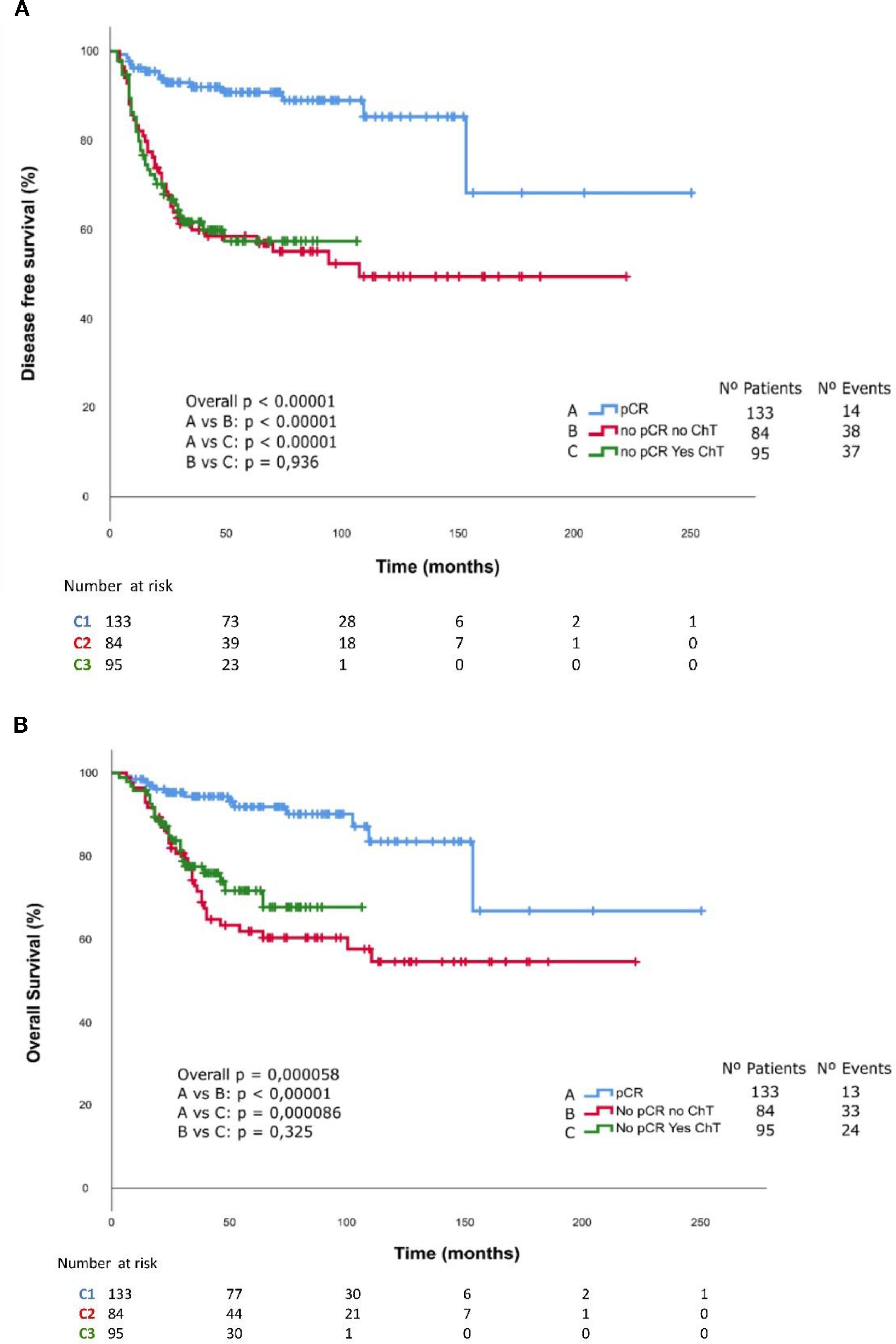 Kaplan-Meier survival curve showing overall survival over time in months. Three groups are represented: pCR (blue), no pCR no ChT (red), and no pCR Yes ChT (green). Statistical data includes overall p-value of 0.000058, A vs. B p < 0.00001, A vs. C p = 0.000086, and B vs. C p = 0.325. Numbers at risk and events for each group are shown with pCR having the highest survival rate.