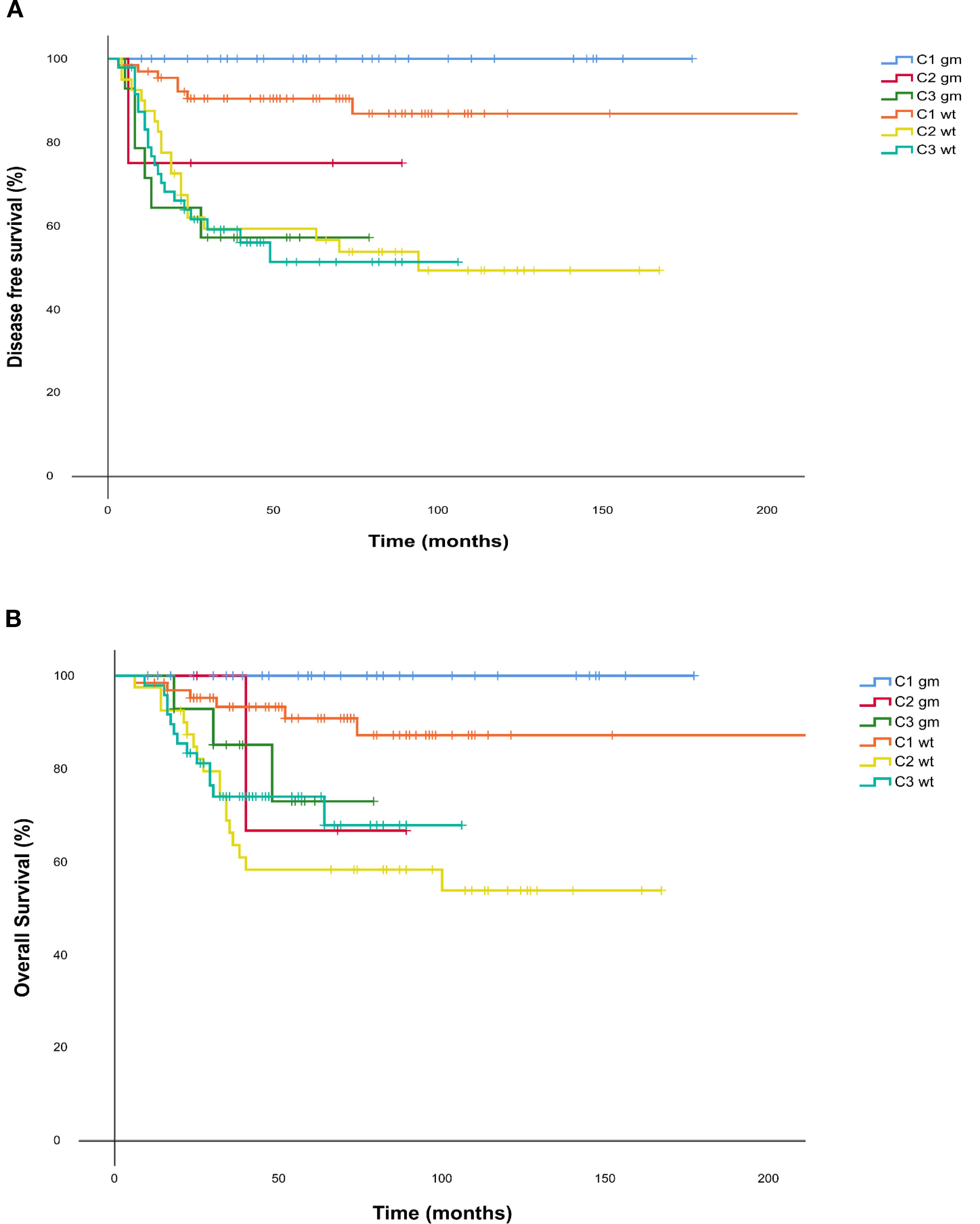 Figure 4. (A) Disease free survival and (B) Overall Survival Kaplan Meier curves for each cohort according to their mutational status. C1 = Cohort 1: pCR; C2 = Cohort 2: no pCR no adjuvant capecitabine; C3 = Cohort 3: no pCR yes adjuvant capecitabine. DFS, disease free survival; gm, germline mutated; OS, Overall survival; wt = wild type.