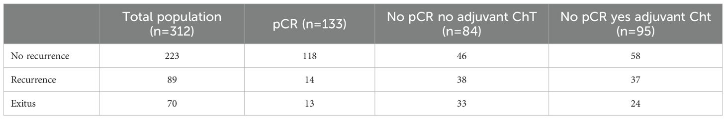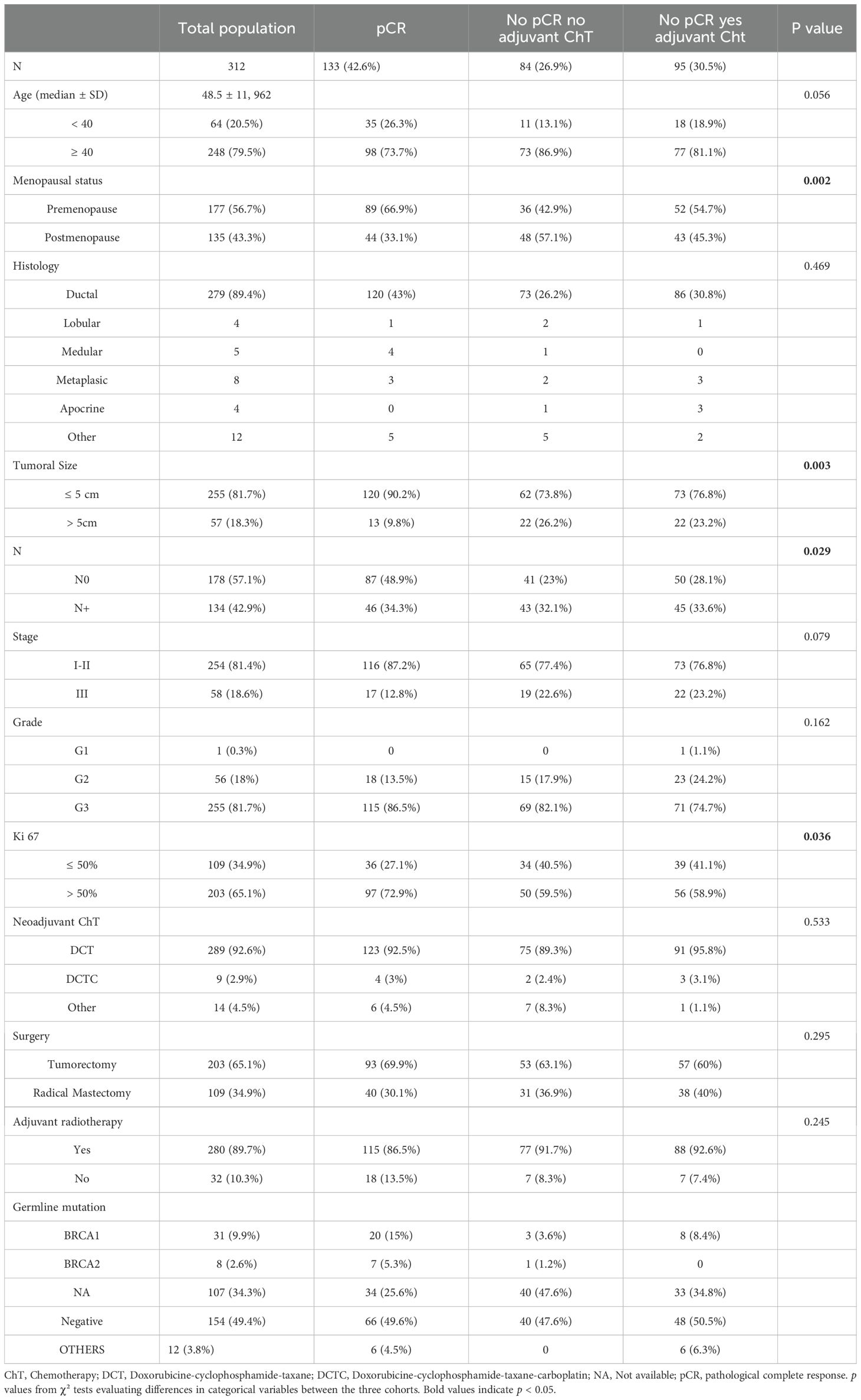 Data from 312 women with early-stage TNBC treated with NAC between 2004 and 2023 were retrospectively collected. The median age at diagnosis was 48.5 years (range: 26-79) and 177 patients (56.7%) were premenopausal. Axillary lymphs node involvement at diagnosis was observed in 134 patients (42.9%) while 57 patients (18.3%) had a tumour size greater than 5 cm. Ki67 proliferation index was greater than 50% in 203 patients (65.1%). Germline mutation testing was conducted in 205 patients (65.7%), revealing 31 patients with a pathogenic BRCA1 mutation and 8 patients with a pathogenic BRCA2 mutation. However, these patients did not receive adjuvant treatment with Olaparib, as it was not yet approved at that time. Other mutations (detected in 12 patients) were ATM, PALB2, RAD51, CDKN2A, MUTYH and MSH6. The majority of patients (95%) received standard NAC, consisting of anthracyclines, cyclophosphamide, and taxanes, with or without carboplatin. Additional baseline clinical and pathological characteristics, stratified by cohort, are summarized in Table 1.