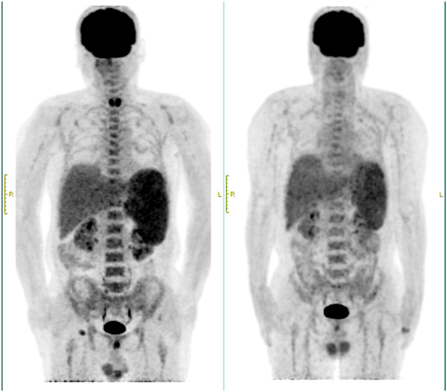 PEC/CT at recurrence and initial diagnosis. The left side was at recurrence in March 2024, and the right side was at initial diagnosis in August 2023.