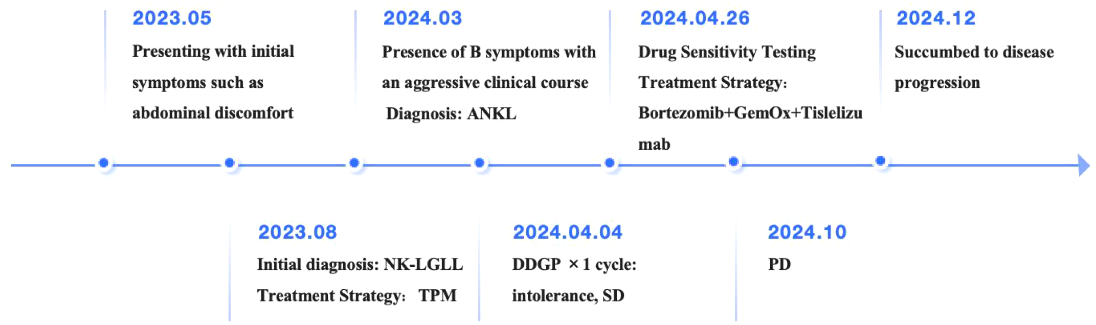 In terms of treatment strategy, the DDGP regimen, which includes Gemcitabine, was employed. After one cycle of therapy, the patient’s response was evaluated as stable disease (SD). However, the patient exhibited poor tolerance to this regimen, and recurrent fever symptoms did not show significant improvement. To explore more effective treatment options, ex vivo drug sensitivity testing was performed using primary tumor cells isolated from the patient’s bone marrow, revealing high sensitivity to both bortezomib and carfilzomib. Additionally, the patient demonstrated high sensitivity to chemotherapy regimens GDP (Gemcitabine + Dexamethasone + Cisplatin), VTD (Bortezomib + Thalidomide + Dexamethasone), ICE (Ifosfamide + Carboplatin + Etoposide), and FLAG (Fludarabine + Cytarabine (Ara-C) + G-CSF) (Supplementary Figure S1). Bortezomib, a proteasome inhibitor, is capable of downregulating the NF-κB signaling pathway. Previous studies have indicated that the NF-κB pathway remains persistently active in LGLL and inhibits apoptosis independently of STAT3 activation (10, 12). Proteasome inhibitors, including Bortezomib and Ixazomib, have been shown to suppress the NF-κB pathway, thereby reducing the proliferation of LGL leukemia cell lines and primary patient cells, and promoting apoptosis (13). Furthermore, immunotherapy is considered a potential treatment strategy for ANKL. Previous studies have shown that Integration of anti-PD-1 antibody into chemotherapeutic regimens improved the outcome of aggressive NK cells leukemia (14). Studies have also demonstrated overexpression of PD-L1 in EBV-negative ANKL patients, suggesting a viable therapeutic target for this rare disease (11). Based on the drug sensitivity results, prior research findings, and consideration of the patient’s tolerance (Unable to tolerate the GDP regimen, GemOx regimen was empirically administered), a personalized treatment regimen combining GemOx (Gemcitabine+ Oxaliplatin), Tislelizumab (an anti-programmed cell death protein-1 antibody), and Bortezomib was devised. Fortunately, after one cycle of treatment, CT scans revealed no abnormal lymphadenopathy, and no abnormal NK cells were detected in the peripheral blood. After two cycles, the patient’s fever symptoms were alleviated, and both peripheral blood and bone marrow flow cytometry showed no detectable phenotypically abnormal NK cells (below the detection limit: 0.006%). MRD remained undetectable until October 2024, when 0.80% of peripheral blood nuclear cells showed an abnormal NK-cell phenotype, indicating disease progression (Supplementary Figure S2). The response thus lasted approximately 5 months following the achievement of CR in April 2024.The patient died of disease progression in December of the same year. Figure 2 is a visualization illustrating the clinical course of the patient.