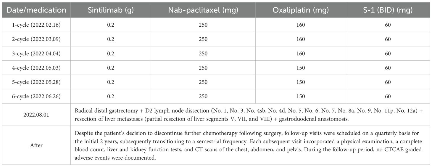Shen et al. (13) and Sun et al. (14) each reported one case of advanced HAS that was successfully converted through chemotherapy. However, the follow-up periods were only 2 and 7 months, respectively, and key biomarkers and TRG were NA. A relevant study (28) has shown that HAS patients treated with anti-HER2 therapy or with dMMR have a favorable prognosis. For HER2-positive advanced HAS, trastuzumab combined with chemotherapy may be employed. Fakhruddin et al. (15) documented a case of HAS where the patient achieved an OS of 18 months after treatment with trastuzumab combined with chemotherapy. Castria et al. (16) documented a case of advanced HAS where the patient achieved pCR with successful conversion therapy using trastuzumab, ramucirumab, and chemotherapy, with an OS exceeding 19 months. For HER2-negative advanced HAS, although no ideal targeted therapy exists, immuno-chemotherapy may be considered for dMMR or CPS >5 cases. Tang et al. (17) reported a case of advanced HAS with a CPS of 20 that achieved a clinical complete response and an OS exceeding 9 months following immuno-chemotherapy. Li et al. (18) documented a case of advanced HAS with dMMR that achieved pCR and PFS exceeding 6 months following successful conversion therapy with immuno-chemotherapy. However, there is currently no ideal treatment for HER2-negative, pMMR, CPS<5 cases. Zhou et al. (20) reported a case of advanced HER2-negative, pMMR-type HAS with an undetermined CPS that achieved pCR and PFS exceeding 1 year following successful conversion therapy with immuno-chemotherapy. Lu et al. (19) reported a case of advanced, HER2-negative, pMMR-type HAS with an undetermined CPS that achieved MPR without surgery, with an OS exceeding 15 months. Although an ORR of 58.8% was achieved in a small cohort of AFPGC treated with immuno-chemotherapy (10, 41). However, HAS patients with hepatic metastases face a poor prognosis, with a 5-year survival rate of only 9% (4), with a median OS of only 6–14 months when treated with chemotherapy alone (28, 42). Notably, for patients with advanced HAS with HER-2-negative expression and concurrent multiple liver and lymph node metastases, no effective treatment currently exists. Consequently, these patients face poor survival outcomes, which significantly threaten their prognosis. In our report, the patient declined postoperative treatment but insisted on regular follow-up. The patient, despite being HER2-negative, pMMR, PD-1-negative, and PD-L1 CPS = 3, received immuno-chemotherapeutic conversion therapy. Remarkably, the patient achieved a pCR and survived 32 months postoperatively, with no evidence of recurrence or residual lesions at the last follow-up. In this particular instance, the dosage of Nab-paclitaxel was modified to 160 mg/m², and that of oxaliplatin to 100 mg/m². This regimen was found to maintain therapeutic efficacy while concomitantly reducing the occurrence of dose-dependent AEs associated with the combination therapy. It is worthy to note that the treatment remained effective even subsequent to a reduction in the oxaliplatin dose, on account of Grade 1 hematologic-related AEs. Notwithstanding the presence of pMMR and PD-L1 CPS = 3, sintilimab elicited an immune response, yielding synergistic effects when administered concurrently with chemotherapy. This case suggests that, even in HER2-negative, pMMR, PD-1-negative, and PD-L1 CPS<5 advanced HAS, the combined immuno-chemotherapy offers therapeutic advantages. The following mechanisms may be postulated: firstly, the administration of chemotherapy has been demonstrated to induce immunogenic cell death; secondly, the use of ICIs has been shown to enhance the tumor microenvironment, increase T-cell infiltration, and reverse immune exhaustion by blocking PD-1-PD-L1 binding and its subsequent effects. This results in significant tumor regression and the attainment of substantial therapeutic outcomes.