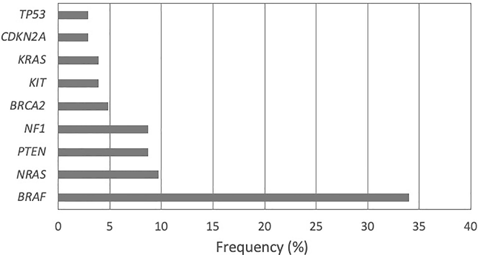 The gene panel analysis containing 142 genes demonstrated 48 different pathogenic variations in 63 patients (61.17%). The number of patients with no pathogenic variations detected was 40 (38.83%). The most frequent pathogenic variations were found in the BRAF gene (33.98%) followed by NRAS (9.71%), PTEN and NF1 (8.74% each), BRCA2 (4.85%), KIT and KRAS (3.88% each), CDKN2A (2.91%), and TP53 (2.91%) (Figure 1).