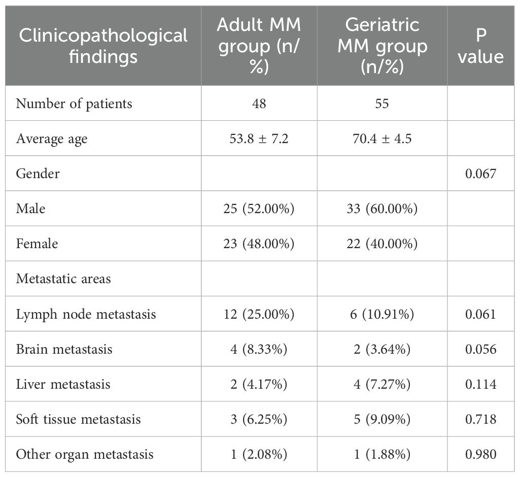 Geriatric MM group included 33 males and 22 females. When the metastatic status of geriatric MM patients was observed, lymph node metastasis was detected in 10.91% of patients, soft tissue metastasis in 9.09%, liver metastasis in 7.27%, brain metastasis in 3.64%, and various types of metastases including skin, lung, tibia, abdomen, and parotid regions in 1.88% of patients.