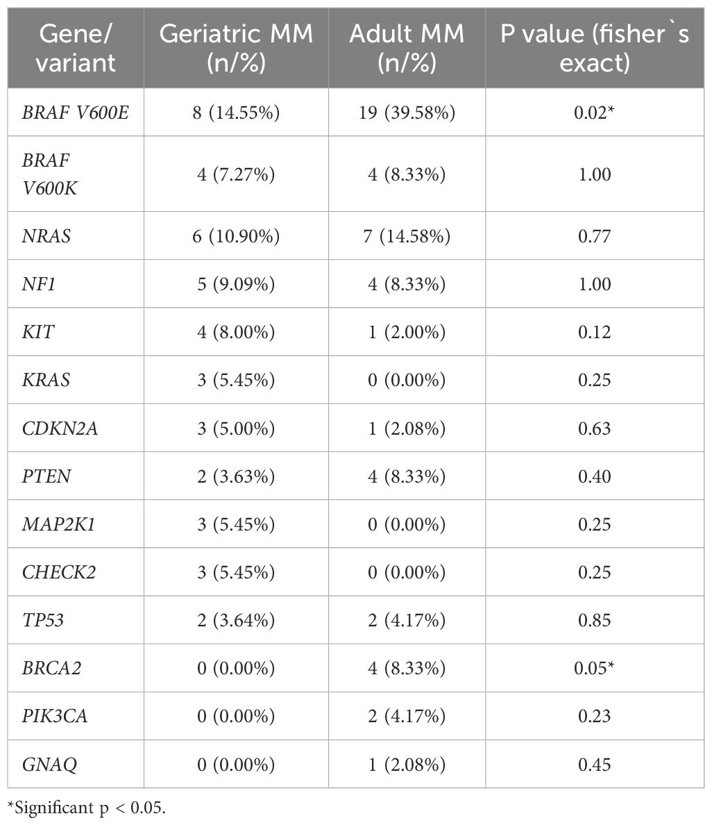 The comparative analysis of pathogenic variants between geriatric and adult MM patients revealed age-related differences in their molecular profiles. In geriatric MM patients, the most frequently observed variants were BRAF V600E (14.55%) and V600K (7.27%) in Exon 15, followed by NRAS (10.90%), NF1 (9.09%), KIT and KRAS (5.45% each), CDKN2A (3.64%), and PTEN (3.63%). In adult MM patients, BRAF V600E (39.58%) and V600K (8.33%) were again the most common, followed by NRAS (14.58%), NF1, PTEN, and BRCA2 (8.33% each), and TP53 (4.17%). Statistical analysis indicated that BRAF V600E (p = 0.02) and BRCA2 (p = 0.05) were significantly more frequent in adults, while other variants did not differ significantly between age groups. Overall, these findings suggest that BRAF V600E and BRCA2 mutations are more characteristic of adult MM, whereas other variants are more evenly distributed across age groups. The ten most frequently observed variants in geriatric and adult patients are summarized in Table 2.