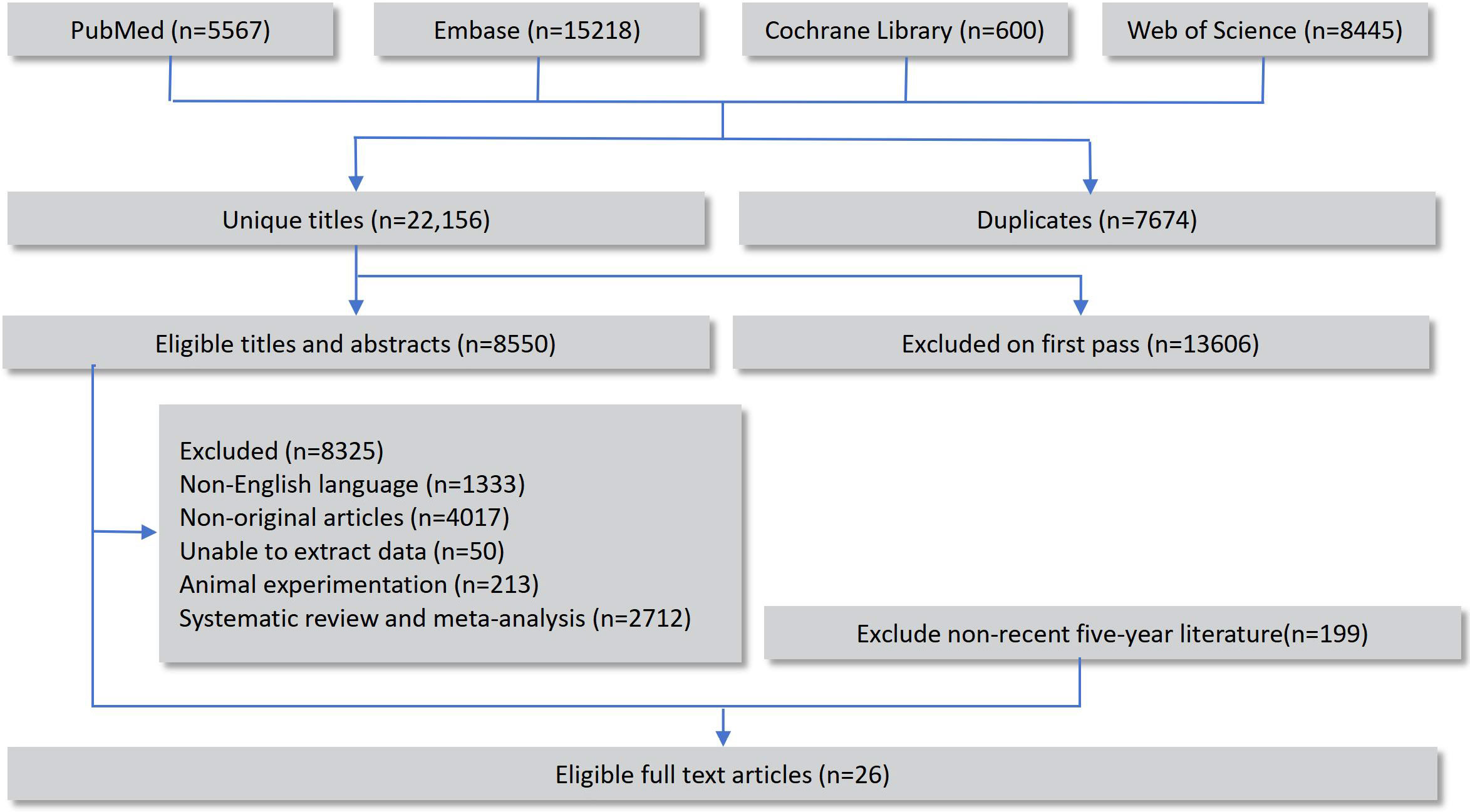 A total of 29,830 records were retrieved through database searches, including 8,445 from Web of Science, 5,567 from PubMed, 15,218 from Embase, and 600 from the Cochrane Library. After removing duplicates, the remaining records underwent preliminary screening and full-text review, and 26 original studies that fulfilled the eligibility criteria were ultimately incorporated into the network meta-analysis (14–39). The overall selection workflow is illustrated in Figure 1.