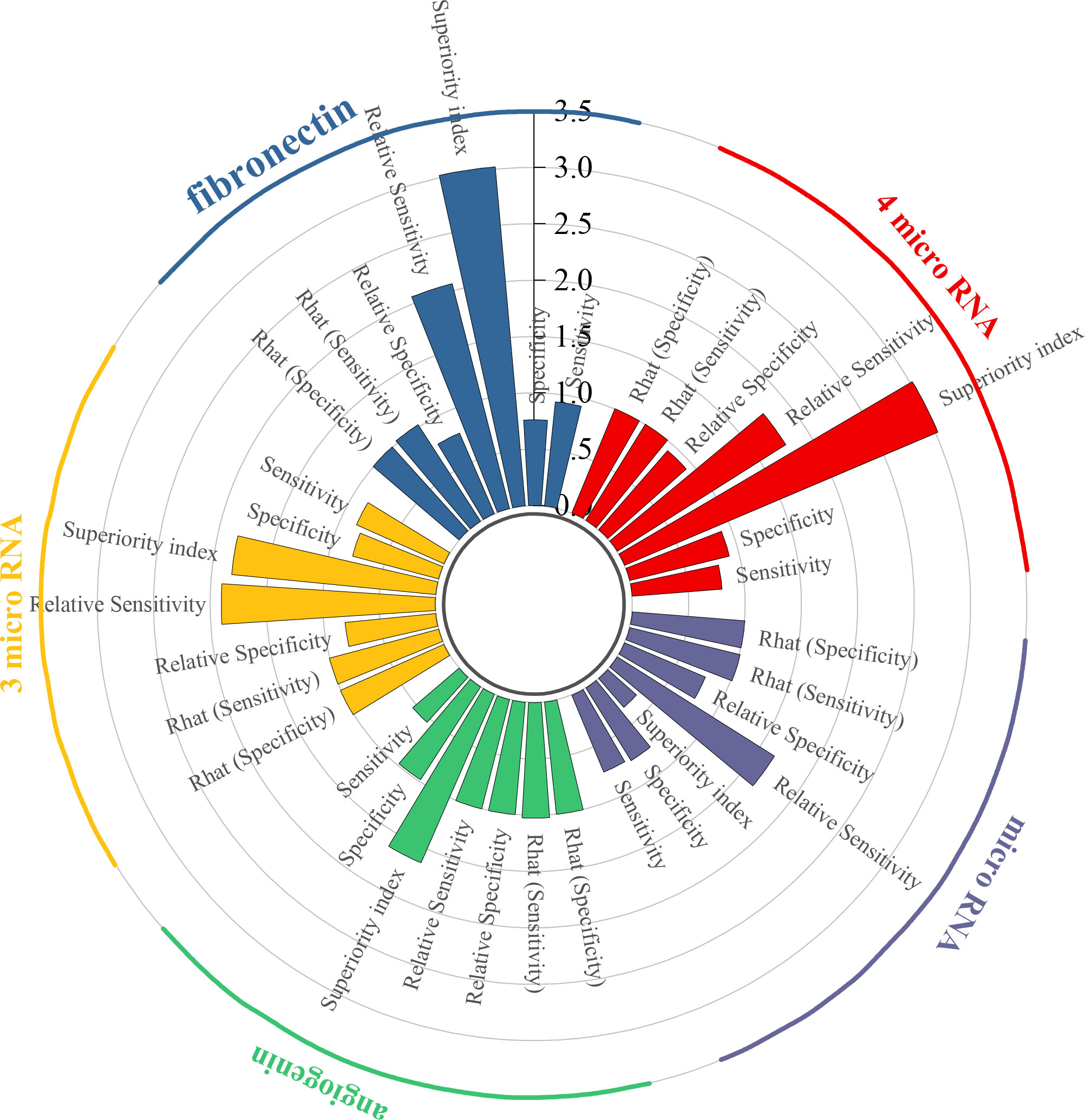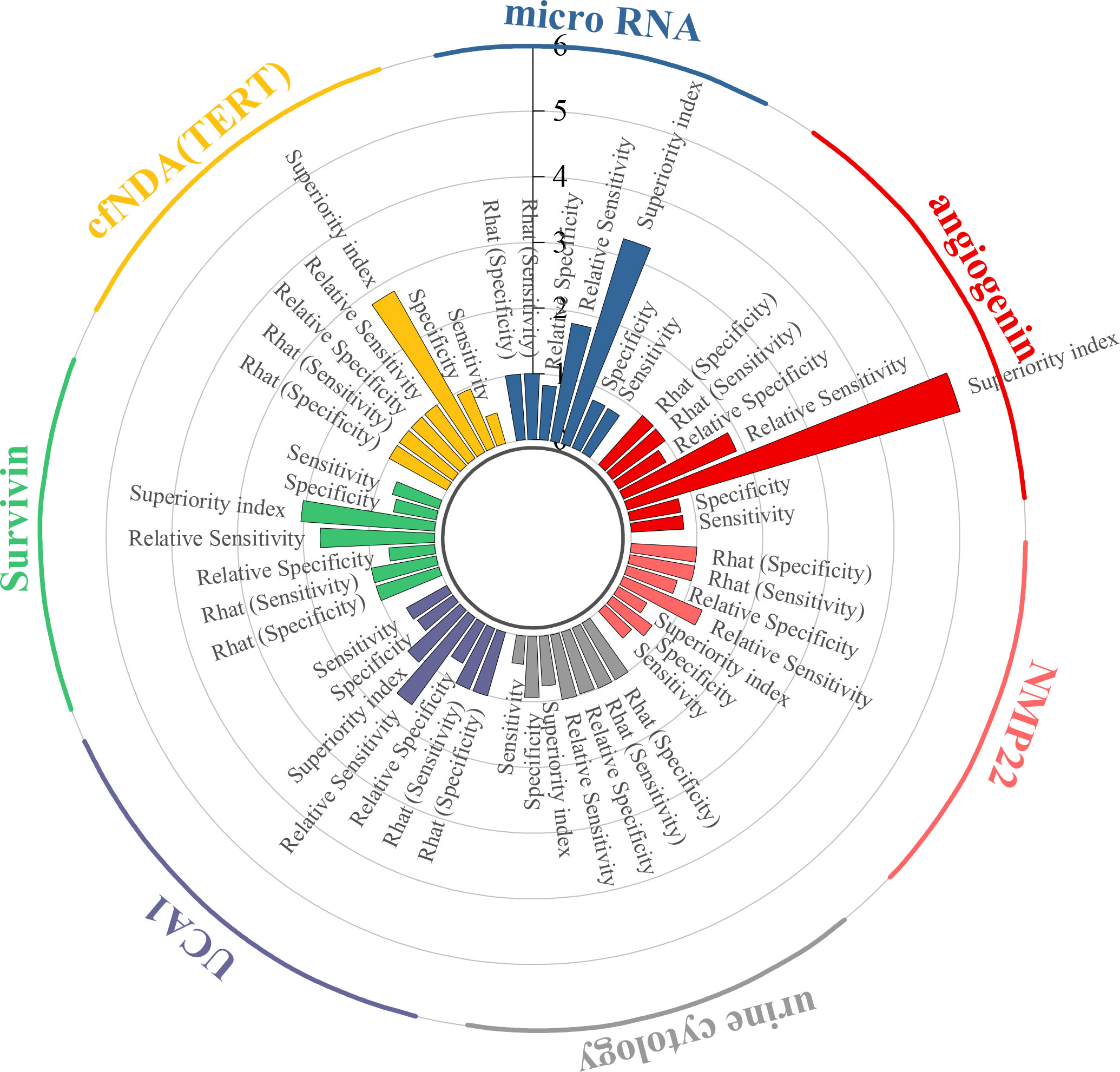 Results: Significant differences in biomarker performance were identified. In urine samples, angiogenin achieved the highest superiority index (5.28), while miR-125b was the best-performing microRNA (10.97). Combined detection strategies involving TERT/FGFR3/TP53/PIK3CA/KRAS demonstrated strong performance (8.54). In blood samples, miR-181b-5p and fibronectin had an index of 3.02, whereas miR-301a-3p exhibited the greatest superiority (50.71).