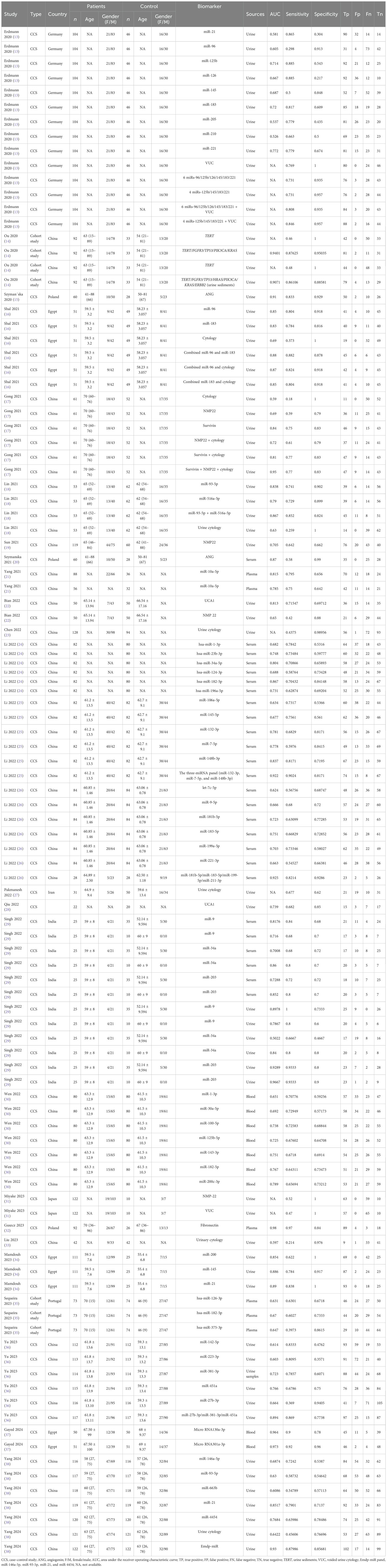 Key features of the eligible studies are outlined in Table 1. Two types of biomarker sources were analyzed: urine and blood. A total of seven types of urine-derived biomarkers were analyzed, including angiogenin, microRNAs, cell-free DNA (TERT), survivin, UCA1, urine cytology, and NMP22 (Table 2). Among the urine-based biomarkers, subgroup analyses were performed for microRNAs and combined detection strategies. In total, 20 different microRNAs and 15 biomarker combinations were evaluated for comparative diagnostic performance (Table 3). The blood-derived biomarkers encompassed five categories, namely: miR-181b-5p/miR-183-5p/miR-199-5p/miR-211-3p, fibronectin, miR-132-3p/miR-7-5p/miR-148b-3p, angiogenin, and other microRNAs (Table 4). The blood-based subgroup analysis included diagnostic performance data for 32 different microRNAs (Table 5).
