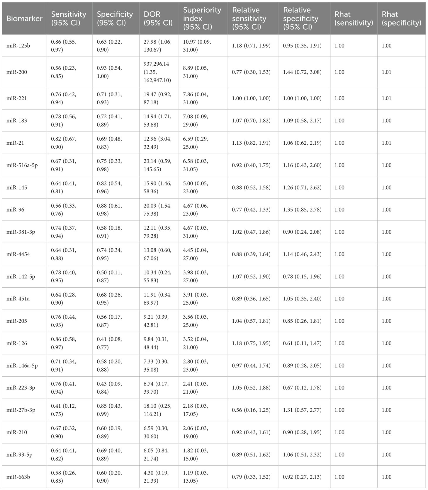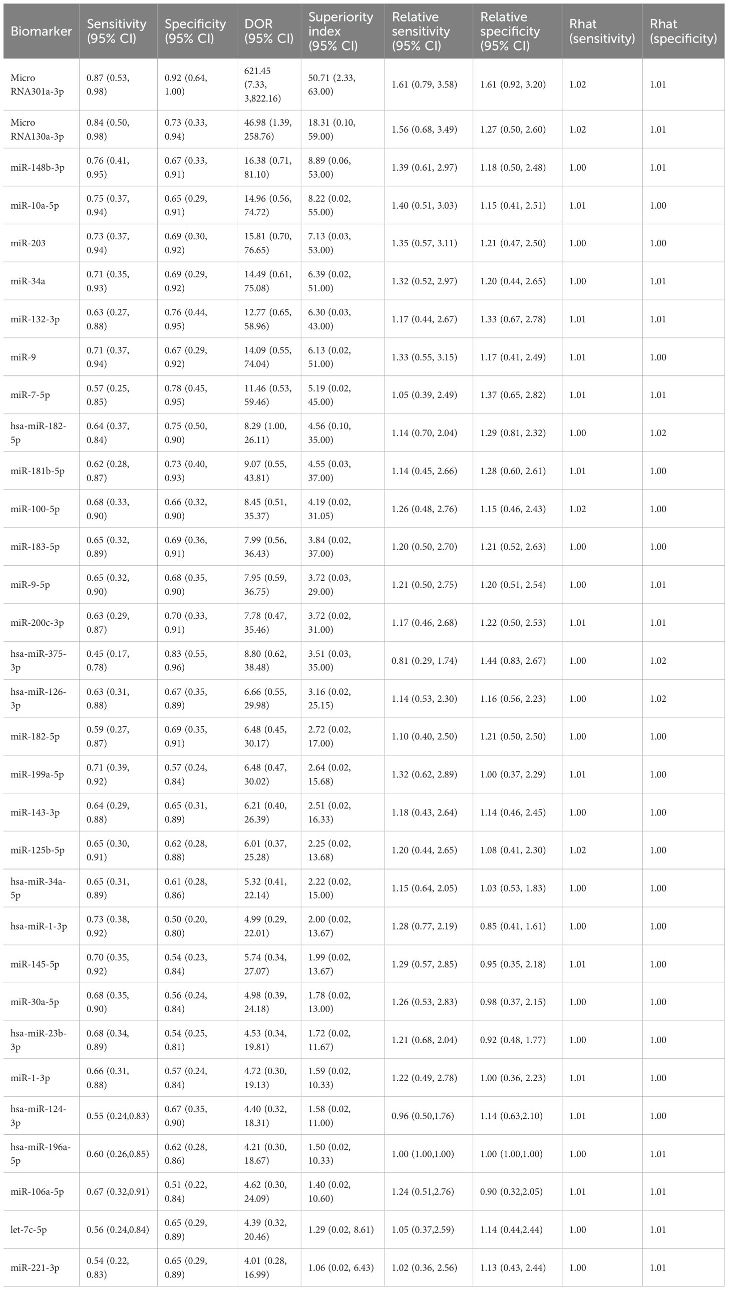 The biomarker microRNA-301a-3p exhibited strong diagnostic potential, with a sensitivity of 0.87 (95% CI: 0.53–0.98), specificity of 0.92 (95% CI: 0.64–1.00), and a superiority index of 50.71 (95% CI: 2.33–63.00). MicroRNA-130a-3p also demonstrated favorable accuracy, with sensitivity of 0.84 (95% CI: 0.50–0.98), specificity of 0.73 (95% CI: 0.33–0.94), and a superiority index of 18.31 (95% CI: 0.10–59.00). For miR-148b-3p, sensitivity was 0.76 (95% CI: 0.41–0.95), specificity was 0.67 (95% CI: 0.33–0.91), and the superiority index was 8.89 (95% CI: 0.06–53.00). The performance of miR-10a-5p was also noteworthy, with sensitivity of 0.75 (95% CI: 0.37–0.94), specificity of 0.65 (95% CI: 0.29–0.91), and a superiority index of 8.22 (95% CI: 0.02–55.00). Finally, miR-203 showed sensitivity of 0.73 (95% CI: 0.37–0.94), specificity of 0.69 (95% CI: 0.30–0.92), and a superiority index of 7.13 (95% CI: 0.03–53.00). Detailed results are presented in Table 6.