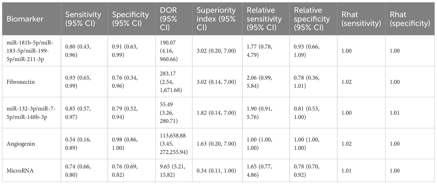 To begin with, the biomarker panel composed of miR-181b-5p, miR-183-5p, miR-199-5p, and miR-211-3p demonstrated a pooled sensitivity of 0.80 (95% CI: 0.43–0.96), specificity of 0.91 (95% CI: 0.63–0.99), and a superiority index of 3.02 (95% CI: 0.20–7.00). Similarly, fibronectin exhibited high sensitivity at 0.93 (95% CI: 0.65–0.99) and specificity of 0.76 (95% CI: 0.34–0.96), with a superiority index of 3.02 (95% CI: 0.14–7.00). In addition, the combined panel of miR-132-3p, miR-7-5p, and miR-148b-3p showed a sensitivity of 0.85 (95% CI: 0.57–0.97), specificity of 0.79 (95% CI: 0.52–0.94), and a superiority index of 1.82 (95% CI: 0.14–7.00). For angiogenin, sensitivity was comparatively low at 0.54 (95% CI: 0.16–0.89), whereas specificity was exceptionally high at 0.98 (95% CI: 0.86–1.00), with a superiority index of 1.63 (95% CI: 0.20–7.00). When microRNAs were considered as a broader diagnostic category, pooled sensitivity was 0.74 (95% CI: 0.66–0.80), specificity was 0.76 (95% CI: 0.69–0.82), and the superiority index was 0.34 (95% CI: 0.11–1.00). Detailed results are presented in Table 5 and Figure 4.