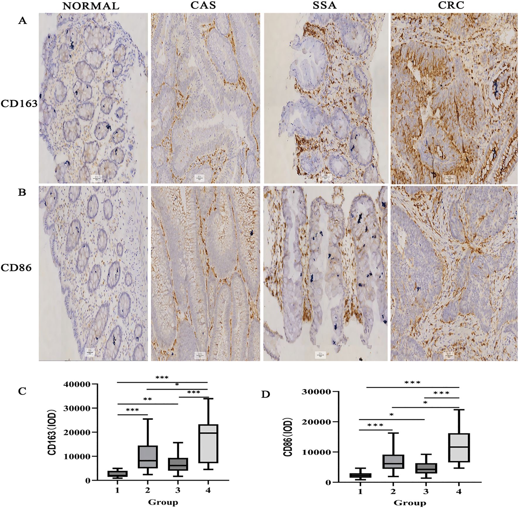 Figure 1. Immunohistochemical detection of CD163+ and CD86+ TAMs in colorectal tissues (×200). (A) CD163 staining in various tissues. (B) CD86 staining. (C) IOD for CD163. (D) IOD for CD86. Data expressed as M (Q1, Q3) (n = 109). *P < 0.05, **P < 0.01, ***P < 0.001 (DB-adjusted). Groups: 1, Normal; 2, CAS; 3, SSA; 4, CRC. M: Median; Q1: 1st Quartile; Q3: 3rd Quartile.