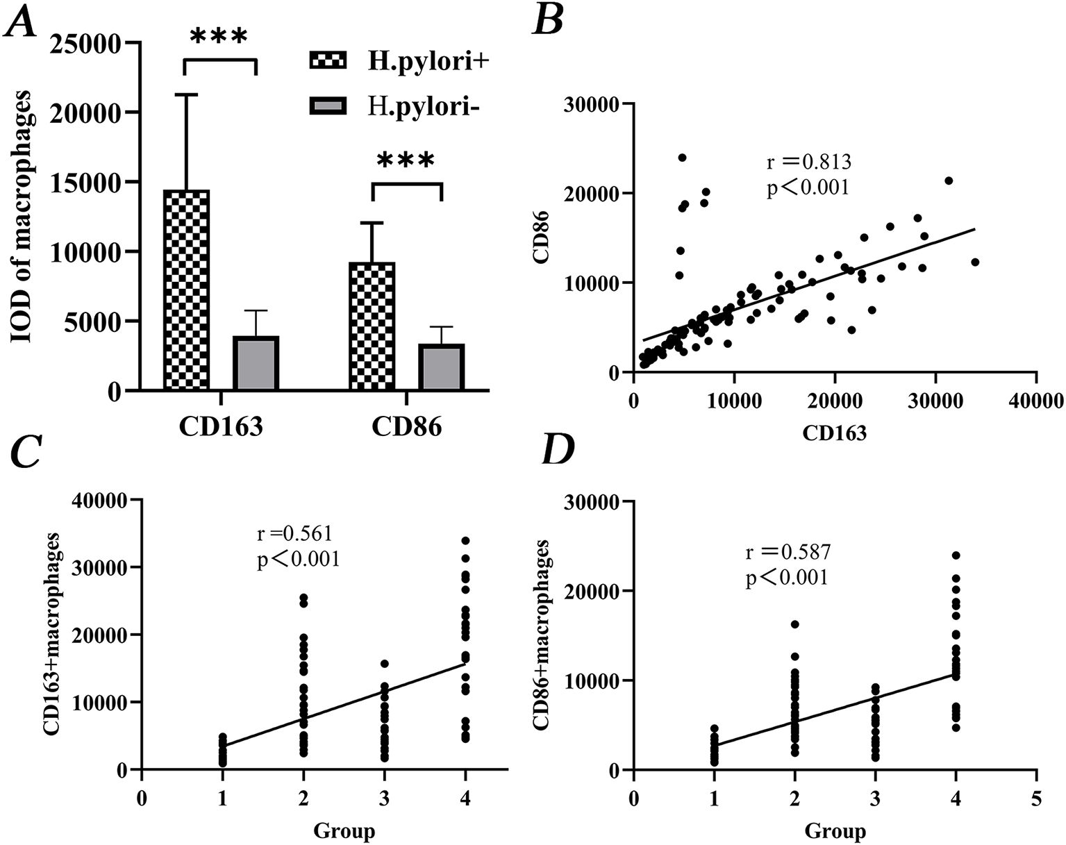 Figure 2. Correlation of CD163+/CD86+ TAMs levels with CRC development. (A) Differential expression between H.pylori-infected and uninfected groups. (B) Correlation between CD163+ and CD86+ expression. (C, D) Positive correlation of both markers with malignancy grade. Groups: 1, Normal; 2, CAS; 3, SSA; 4, CRC. ***P < 0.001 (MWU test).