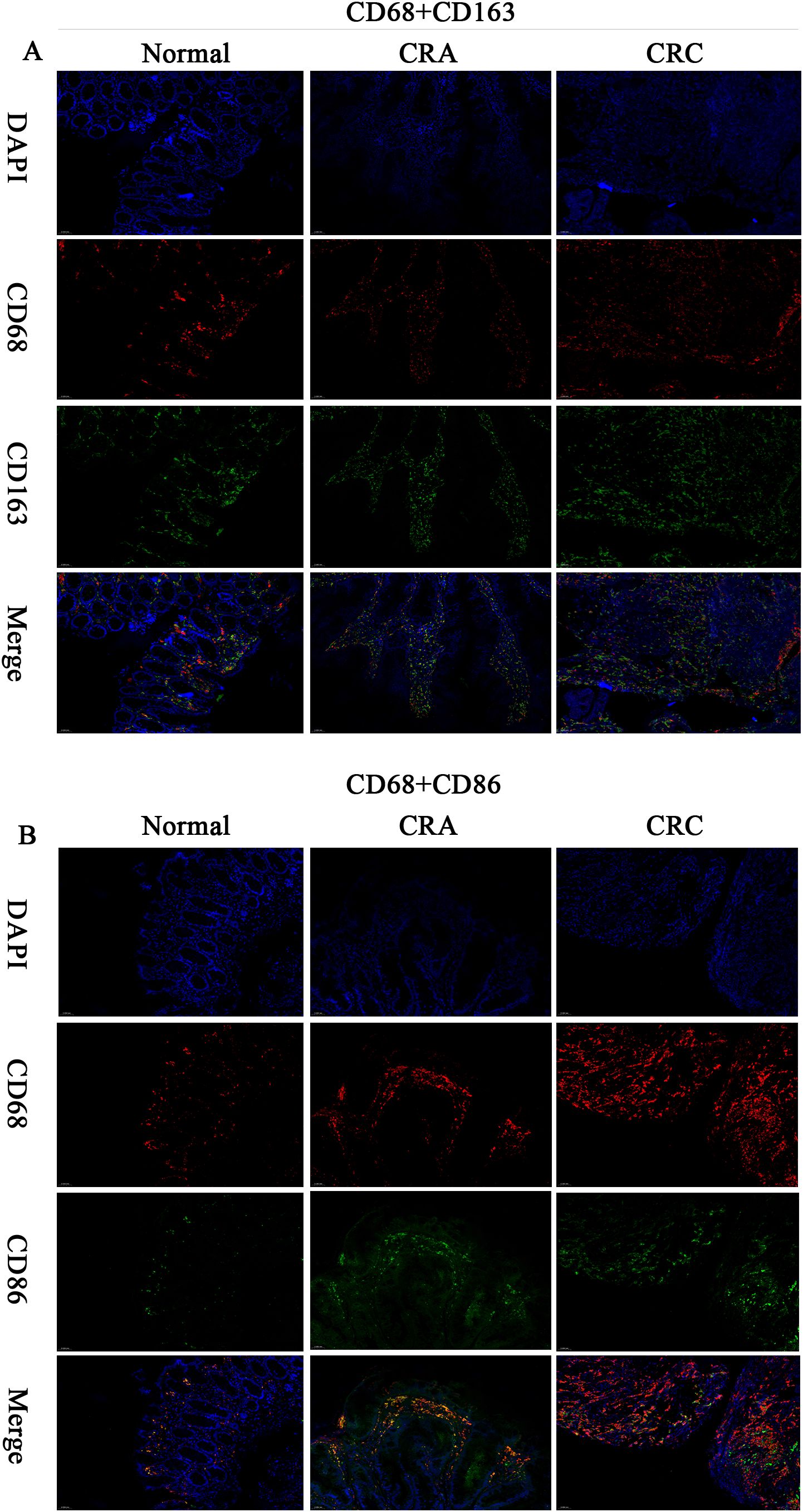 mIF-based quantitative analysis revealed significantly higher counts of CD68+CD163+ and CD68+CD86+ TAMs and an elevated CD68+CD163+/CD68+CD86+ TAMs ratio in the CRC cohort (n=6) compared to the CAS cohort (n=10) and normal controls(n=4). The overall trend in tissue expression was as follows: CRC > CRA > Normal (all P < 0.001). (Figures 3, 4).