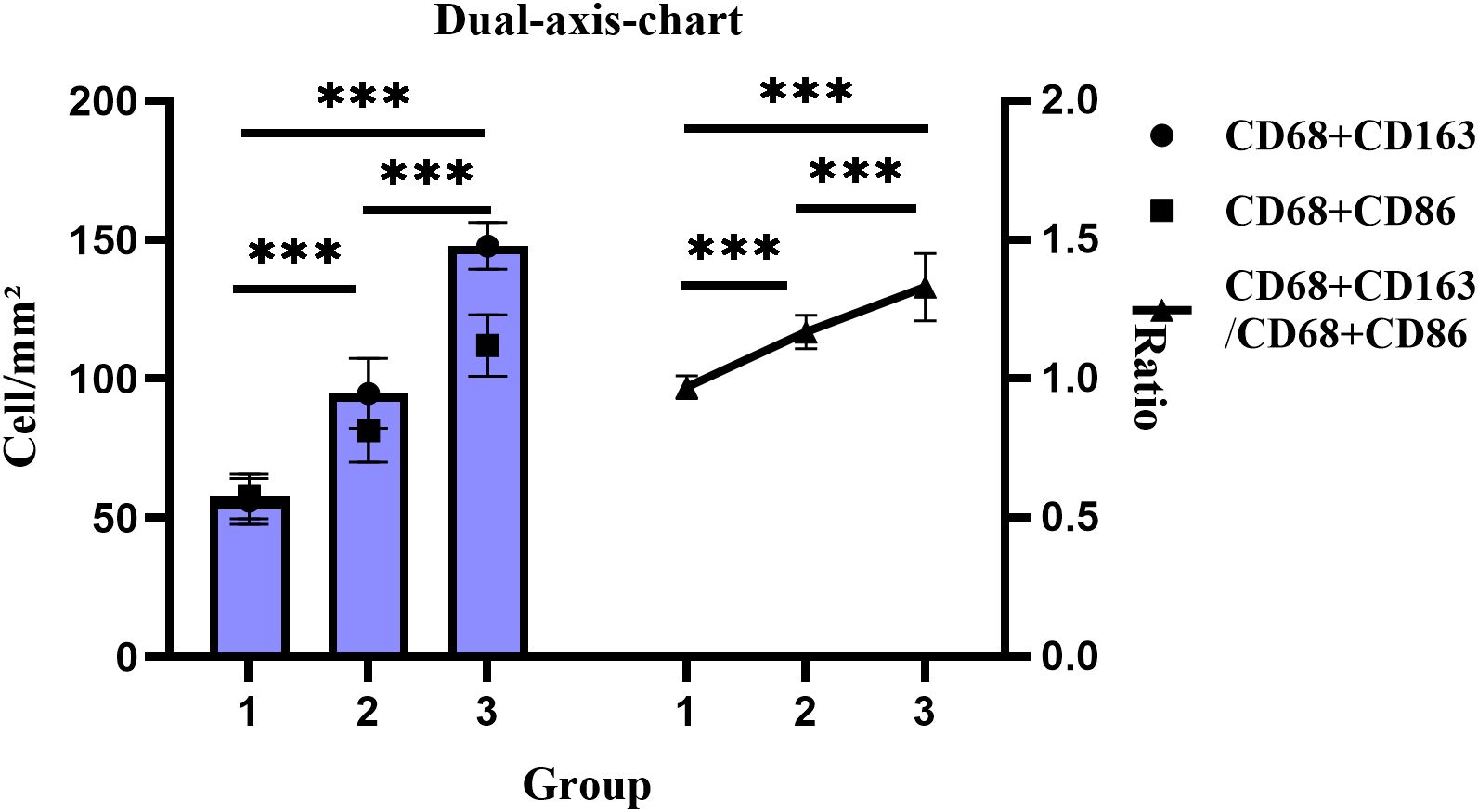 Figure 4. Changes in cell density and proportion of CD68+CD163+/CD68+CD86+ dual-positive TAMs across groups. Groups: 1, Normal; 2, CRA; 3, CRC. ***P < 0.001 (Tukey HSD).