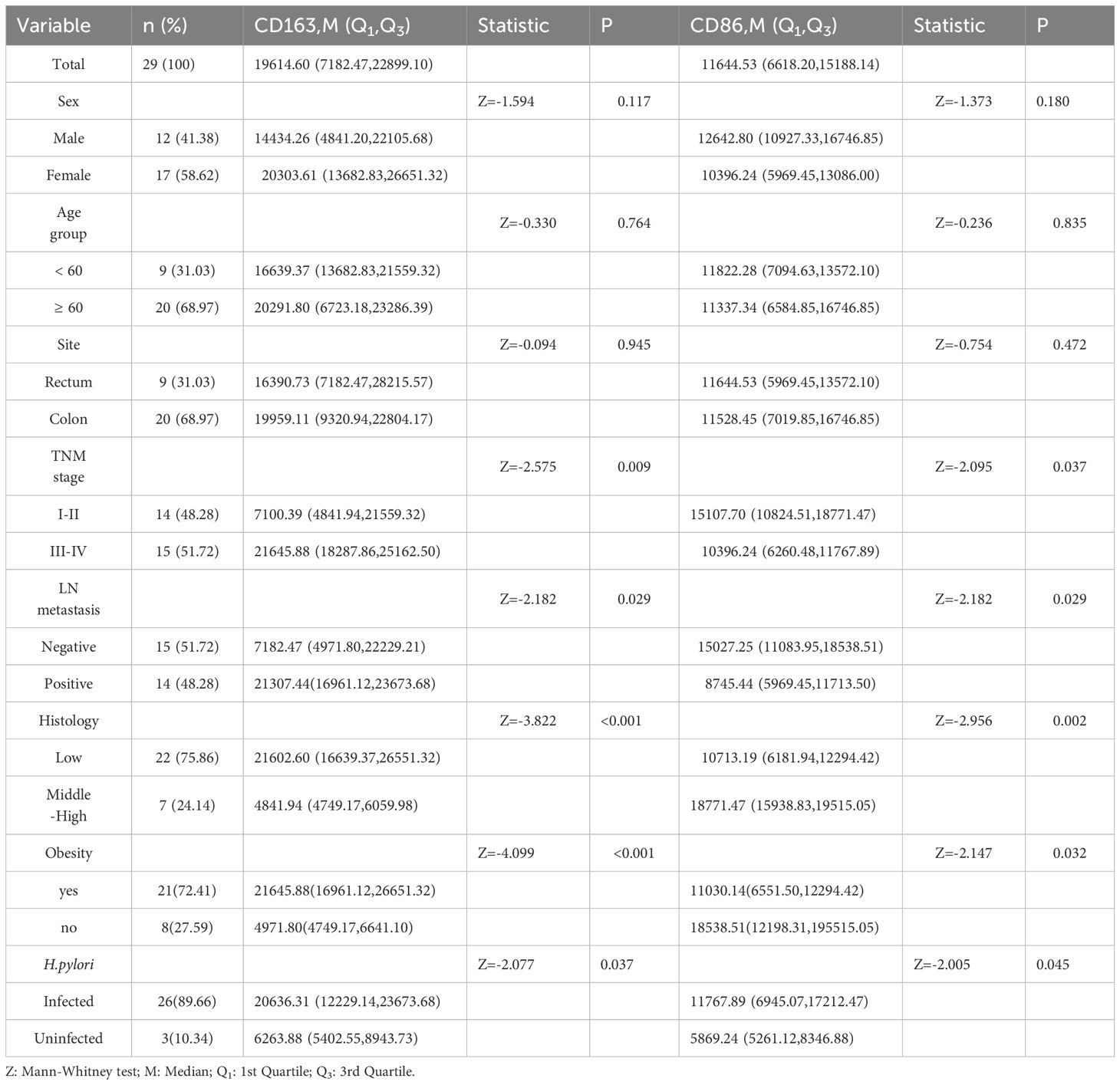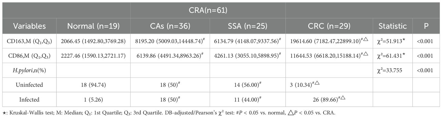 3.2 Association between CD163+/CD86+ TAMs, H. pylori infection, and colorectal malignancy