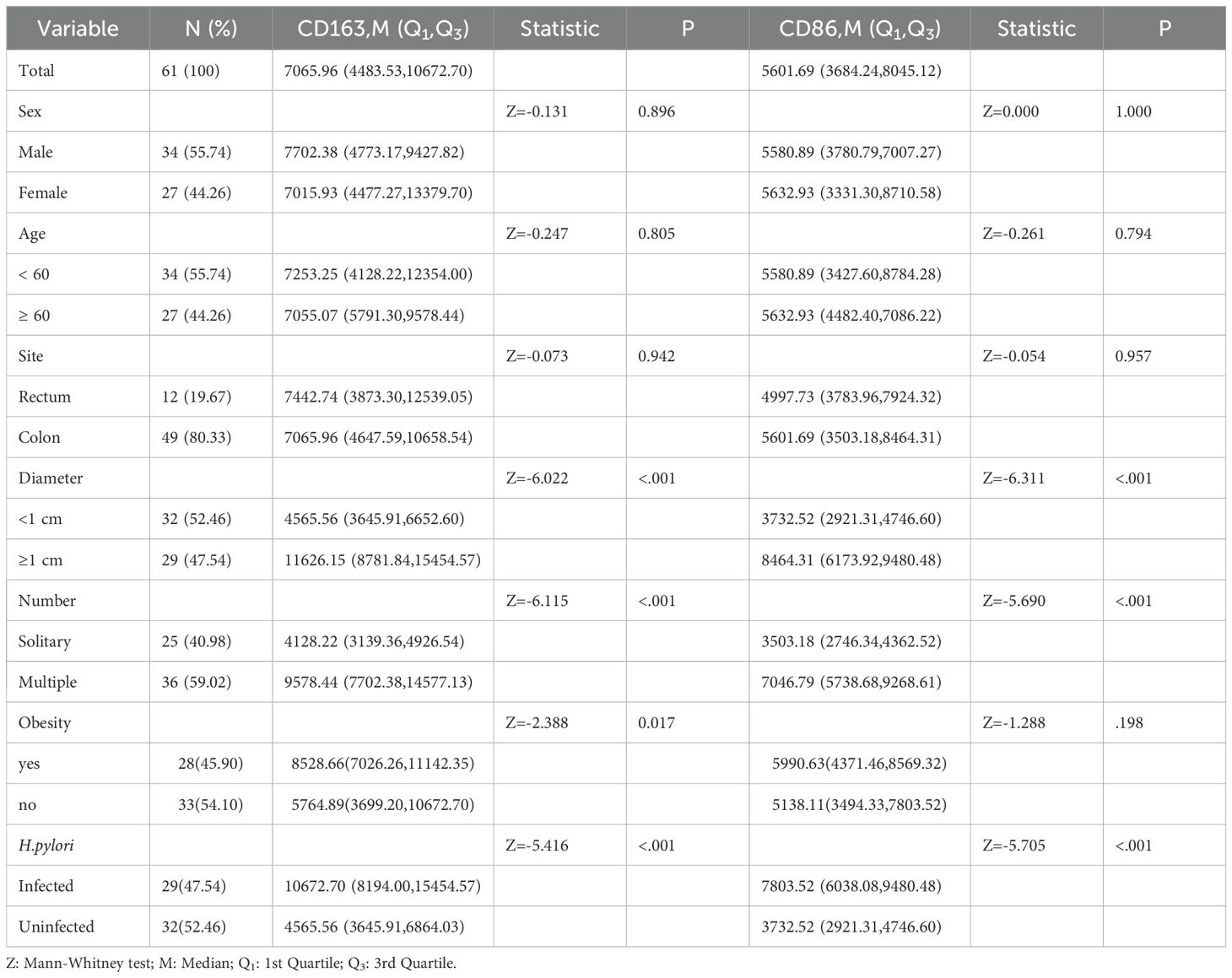 In the CRA group, patients with adenomas ≥1 cm in diameter had higher expression of CD163+ and CD86+ TAMs than those with smaller adenomas (P < 0.05). Similarly, patients with multiple adenomas showed higher expression than those with single adenomas (P < 0.05). Patients who were H.pylori-positive also had higher marker expression than non-infected individuals (P < 0.05) (Table 2).