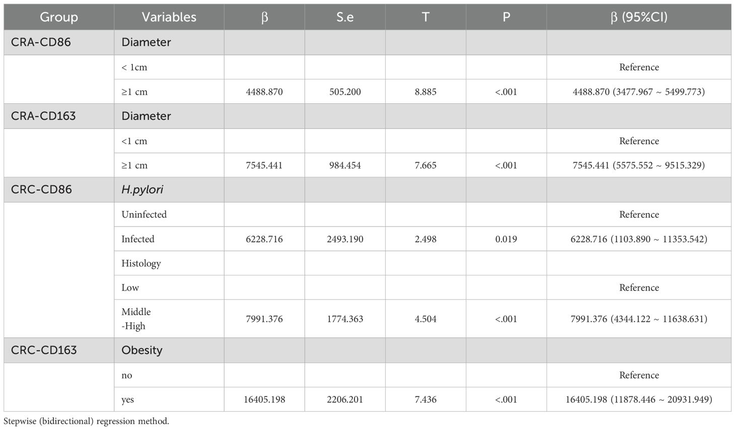 Prior to constructing the multivariate linear regression model, we first performed univariate analyses to screen clinical variables associated with TAMs expression. Covariates ultimately included in the model comprised variables with P-values < 0.05 in the univariate analyses, as well as important potential confounders identified based on clinical knowledge and expert judgment. Accordingly, factors such as adenoma size, adenoma number, obesity, tumor differentiation grade, lymph node metastasis, TNM stage, and H. pylori infection were collectively included in the final model. This strategy ensured that the model incorporated both statistical associations from the data and biological plausibility, thereby enabling a more accurate estimation of the independent associations between these factors and TAMs expression.