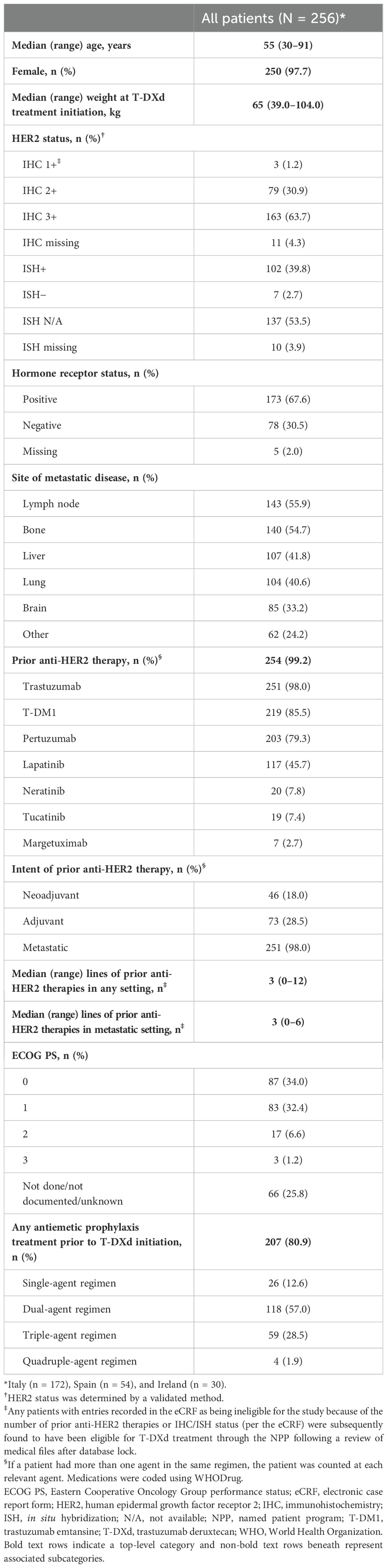 Between November 22, 2022, and December 1, 2023, 20 centers in three countries enrolled 256 patients in total in the EUROPA T-DXd study (Italy, n = 172; Spain, n = 54; and Ireland, n = 30), as summarized in Figure 1. All enrolled patients received T-DXd under the NPP.