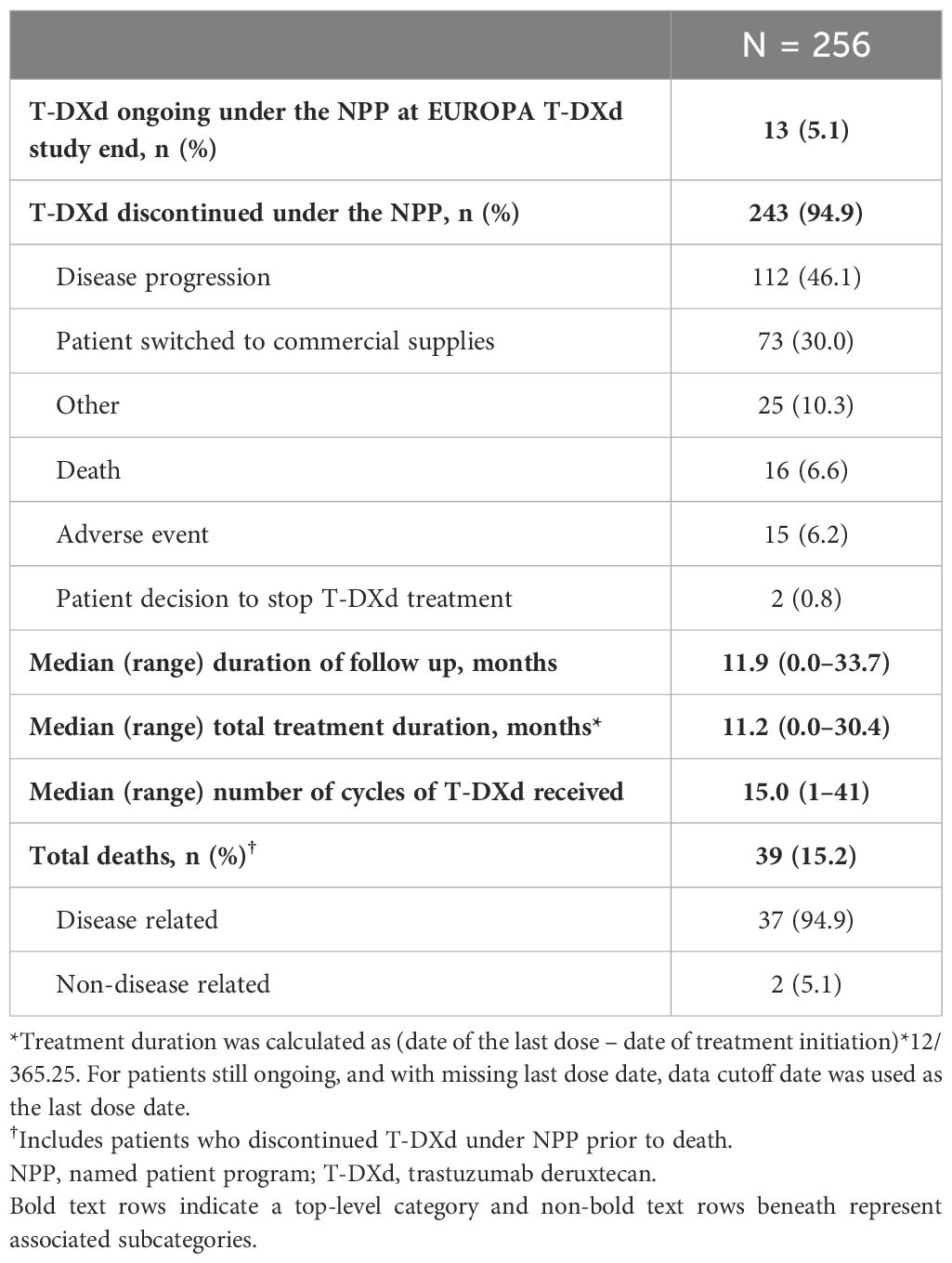 Patient disposition is summarized in Table 2. At the time of data cutoff (March 28, 2024), 5.1% of patients (n = 13) were still receiving T-DXd treatment under the NPP. In total, 94.9% of patients (n = 243) had discontinued T-DXd treatment under the NPP. The main reasons for discontinuation included disease progression (46.1%, n = 112) and patients switching to commercial supplies of T-DXd (30.0%, n = 73). The median (range) follow-up duration was 11.9 (0.0–33.7) months. Overall, 39 deaths were reported; of these, 94.9% (n = 37) were related to disease.