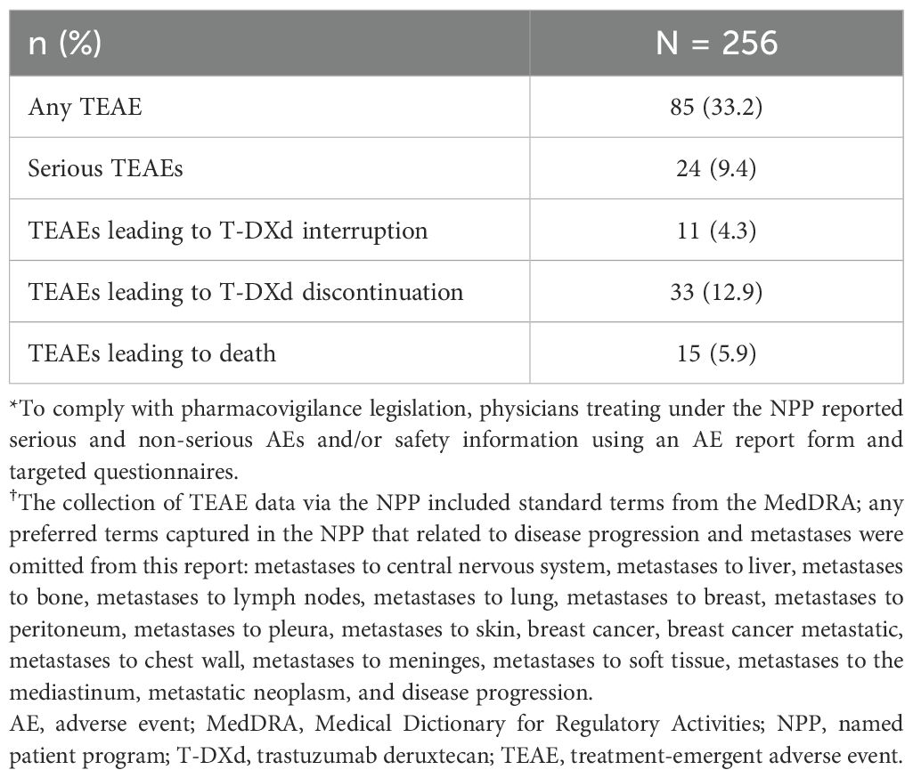 This study provides a robust evaluation of real-world outcomes for a selected group of patients who received T-DXd under the NPP for HER2-positive metastatic breast cancer. However, it is associated with limitations: