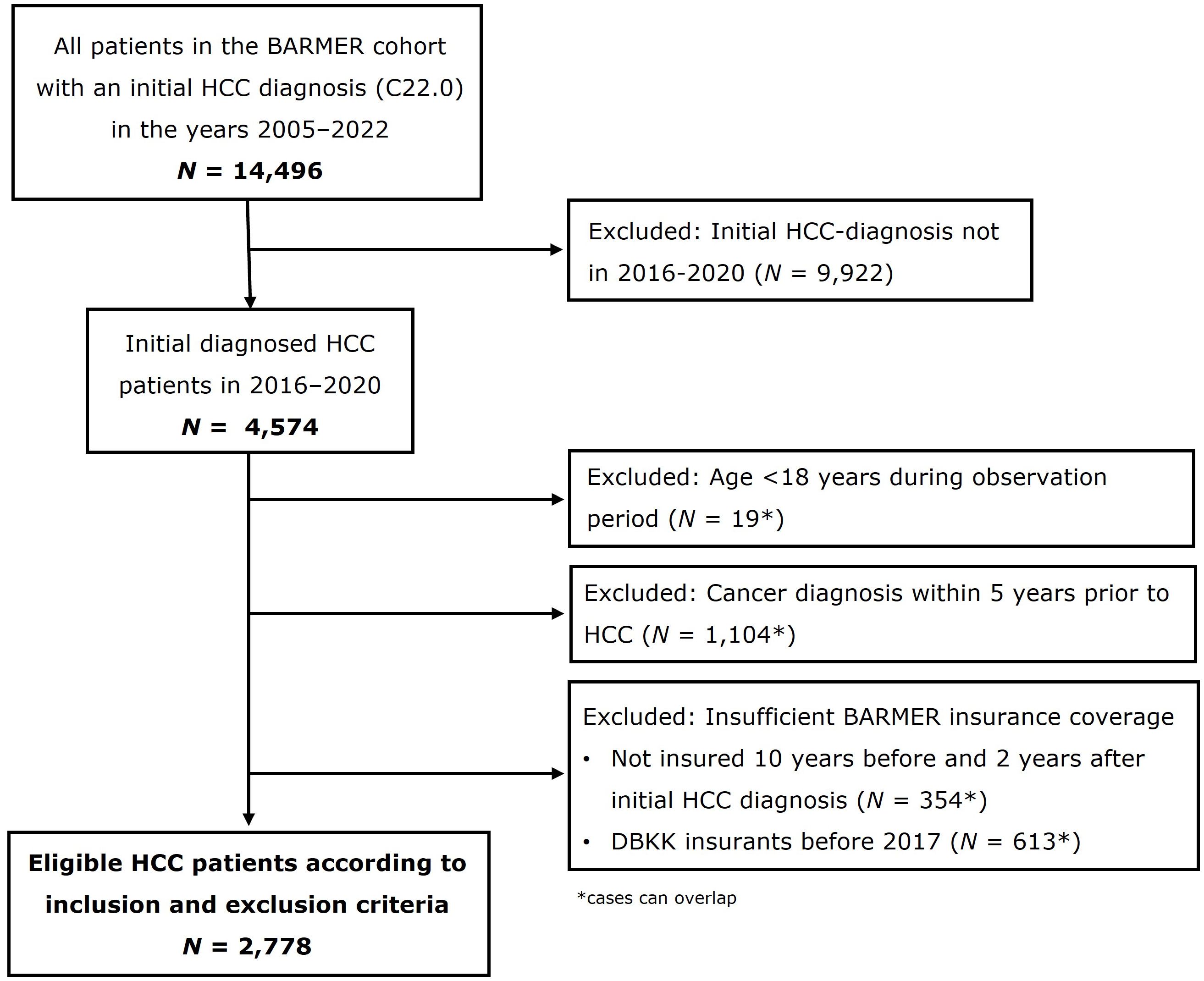 Patients with incident HCC were identified according to ICD-10-GM code C22.0 between 1 January 2016 and 31 December 2020. Patients aged ≥18 years with either one primary diagnosis of HCC in an inpatient setting or two confirmed diagnoses of HCC in an office-based or outpatient hospital setting during consecutive quarters were included. Patients with previously confirmed cancer diagnoses other than carcinoma in situ or non-melanoma skin cancer within 5 years prior to the HCC diagnosis were excluded because these diseases can influence the prognosis and treatment options for patients with HCC. Furthermore, these criteria distinguished incident HCC cases from prevalent or recurrent HCC cases and excluded uncertain diagnoses and liver metastases from other cancers documented as HCC. Individuals without BARMER insurance coverage for at least 10 years before and 2 years after the date of the HCC diagnosis (or unless death occurred before the diagnosis) and those insured by Deutsche BKK, a health insurance that integrated into BARMER in 2017, were excluded to ensure sufficient insurance records during the observation period. The index date of the first HCC diagnosis was defined as the date of the earliest inpatient or outpatient visit with a recorded diagnosis of HCC.
