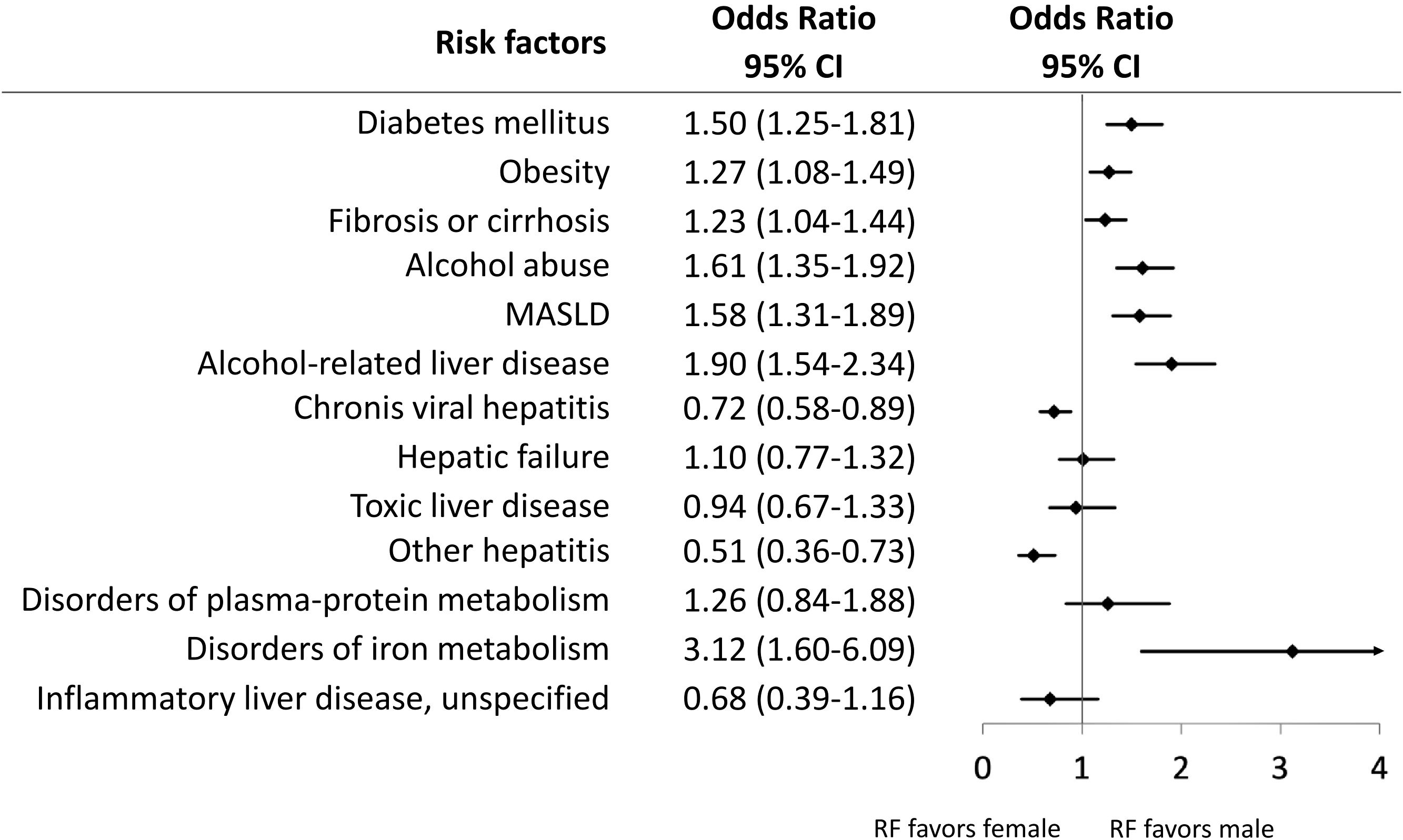 Figure 2. Forest plots of the female to male odds ratios (OR) and 95% confidence intervals (CI) for HCC risk factors (RF).