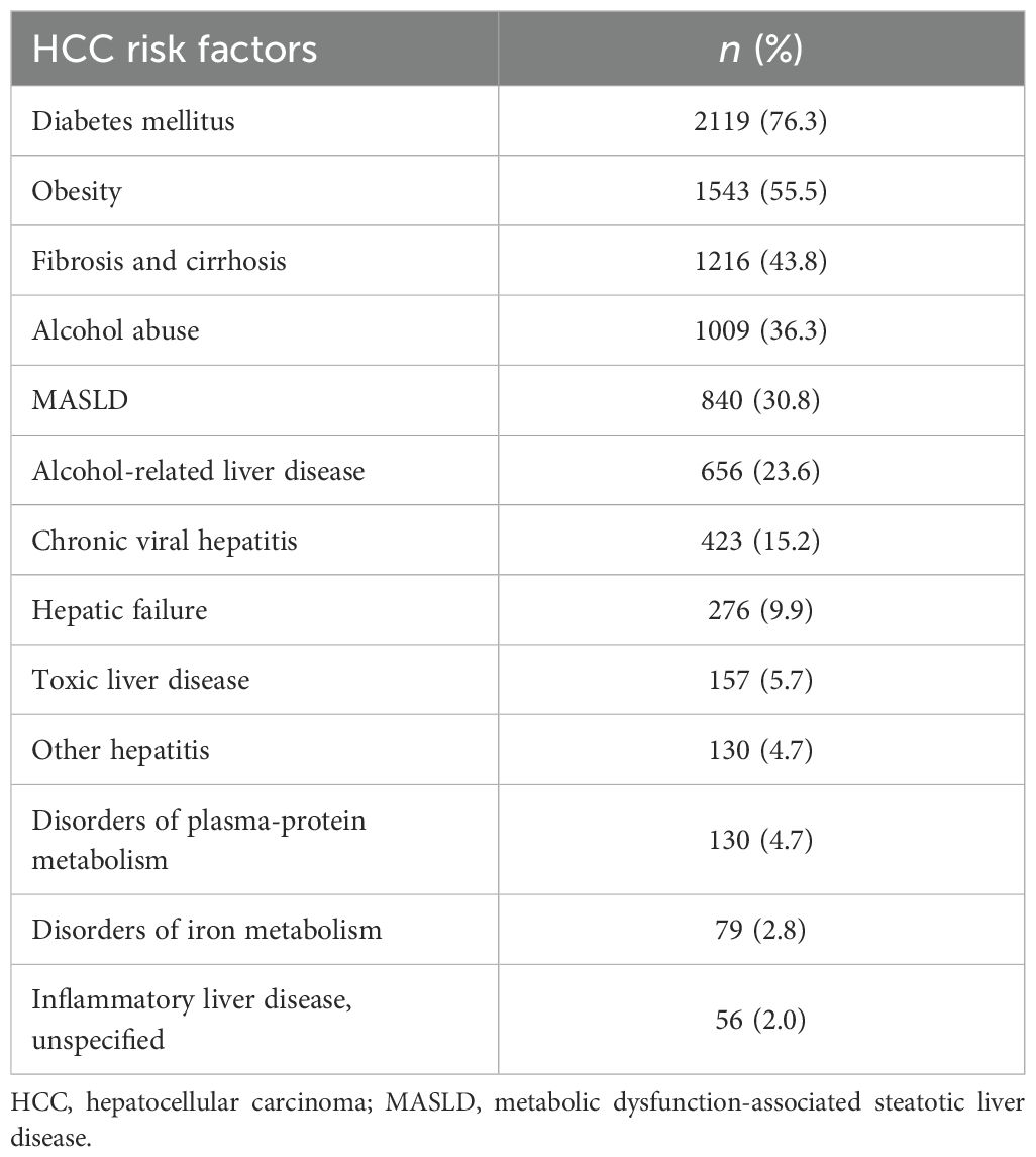 In the Netherlands, approximately 20% of HCC cases develop in non-cirrhotic livers, predominantly in patients with MASLD (29). A similar proportion of patients with non-cirrhotic livers were identified in a large single-center HCC cohort in Germany (30). Contrary to these findings, liver fibrosis or cirrhosis was documented before the HCC diagnosis for only 43% of patients in our study. This comparatively low number could be attributable to the potential underestimation of affected patients with liver fibrosis or cirrhosis never seek clinical care and, therefore, remain undiagnosed (31). Because health insurance claims data are used for reimbursement purposes, diseases that were not diagnosed by a physician were not documented in the data source.