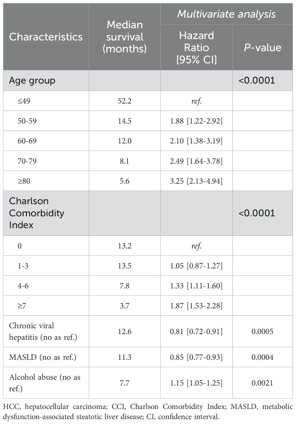 The multivariate Cox regression analysis revealed that age, CCI, chronic viral hepatitis, MASLD, and alcohol abuse were independent predictors of patients’ survival (Table 3). The median survival time following HCC diagnosis ranged from 52.2 months in patients younger than 50 years to 5.6 months in those aged 80 years and older (HR, 3.25; 95% CI, 2.13-4.94; p<0.0001). A higher CCI was associated with reduced survival time Patients with no or a low burden of comorbidities had prolonged survival (p<0.0001). Regarding risk factor diagnosis, patients with documented alcohol abuse had reduced survival compared to patients without alcohol abuse prior to the HCC diagnosis (HR, 1.15; 95% CI, 1.05-1.25; p=0.0021). Patients diagnosed with chronic viral hepatitis (HR, 0.81; 95% CI, 0.72-0.91; p=0.0005) or MASLD (HR, 0.85; 95% CI, 0.77-0.93; p=0.0004) had prolonged survival. The other investigated risk factors were not identified as independent predictors of survival.