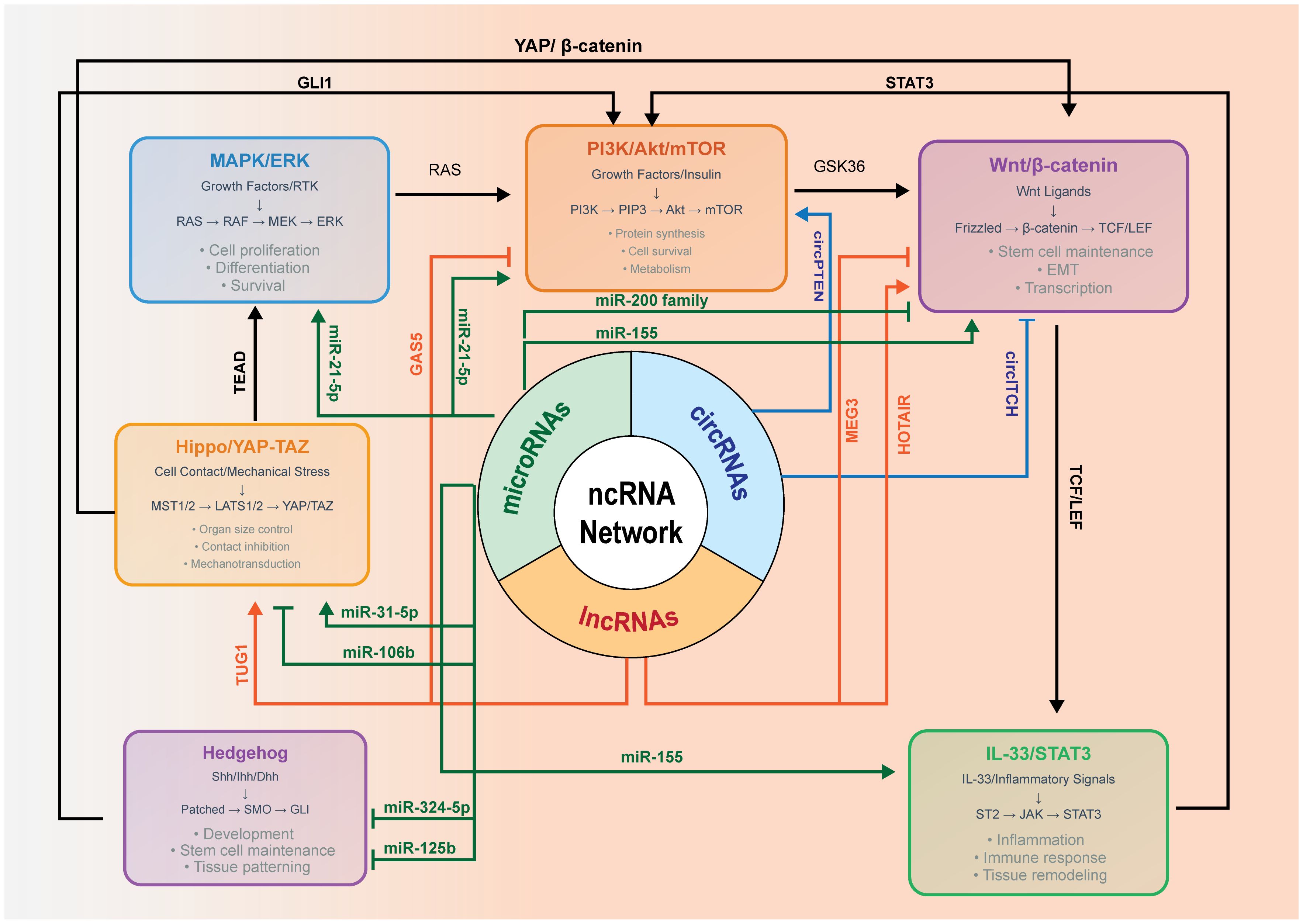 Figure 1. Non-coding RNA (ncRNA)-mediated crosstalk among MAPK/ERK, PI3K–Akt–mTOR, Wnt/β-catenin, IL-33/STAT3, and Hippo/YAP–TAZ in ameloblastoma.