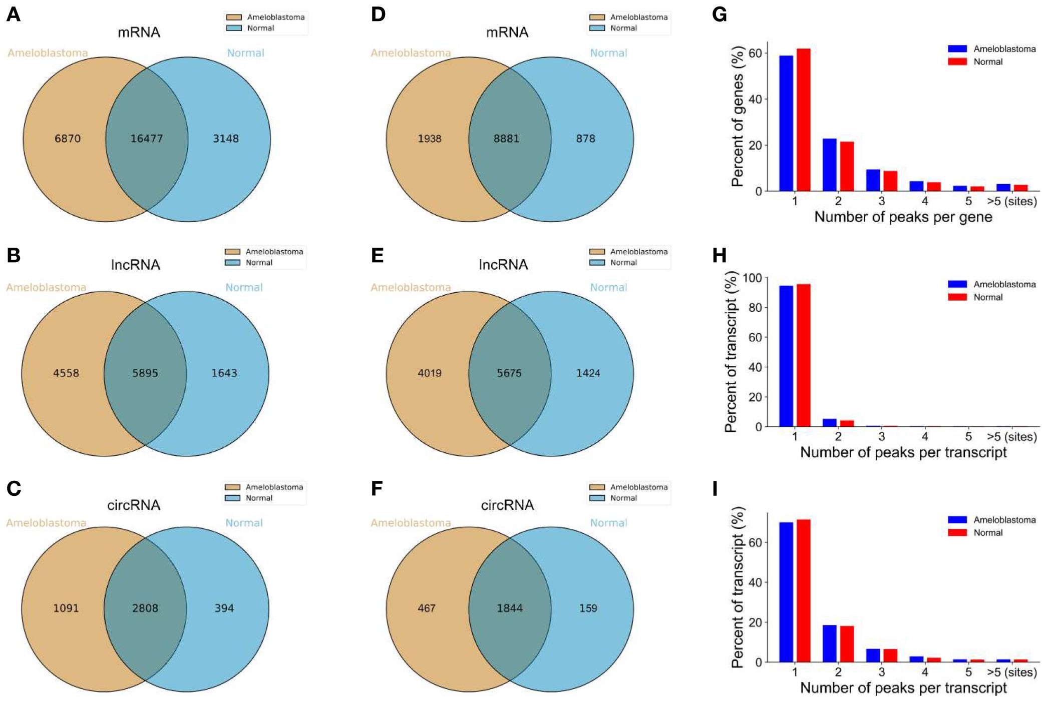 Figure 2. Overview of the m6A-modified peaks within messenger RNAs (mRNAs), long non-coding RNAs (lncRNAs), and circular RNAs (circRNAs) in ameloblastoma and adjacent normal oral tissues. (A–C) Venn diagram depicting the overlapping and non-overlapping m6A peaks within the mRNAs, lncRNAs, and circRNAs between the two groups. (D–F) Venn diagram showing the differences and overlaps in the m6A-modified mRNAs, lncRNAs, and circRNAs between the two groups. (G–I) Number of m6A peaks per mRNA, lncRNA, and circRNA between the two groups (5).