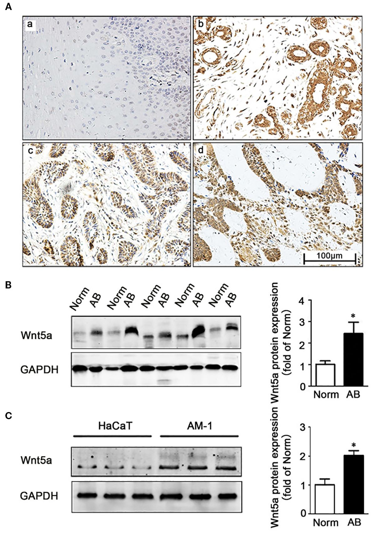 Figure 3. Expression of Wnt5a in ameloblastoma tissues and AM-1 cells. (A) Immunohistochemistry staining demonstrating Wnt5a protein expression in normal oral mucosa tissues (a) and in ameloblastoma tissues (b–d) [follicular type for (d, c) and plexiform type for (d)]. Scale bar, 100 µm. Magnification, ×200. (B) Western blot showing the Wnt5a protein expression in tumor-adjacent normal and ameloblastoma tissues. (C) Western blot showing the Wnt5a protein expression in HaCaT and AM-1 cell lines. *p < 0.05 (21).