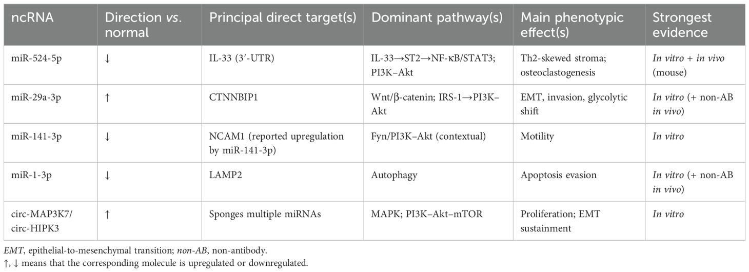 Such findings underscore ncRNAs orchestrating a complex regulatory crosstalk among oncogenic pathways. For example, the miR-29a-3p-driven IRS-1 expression potentiates PI3K/Akt signaling, while miR-141-3p loss removes the repression of NCAM1, which in turn recruits Fyn–PI3K complexes. These events synchronize with the IL-33/ST2 axis influenced by miR-524-5p depletion. Together, these interlinked loops reinforce MAPK, Wnt/β-catenin, and mTOR activity, forming a resilient oncogenic network (18–20).
