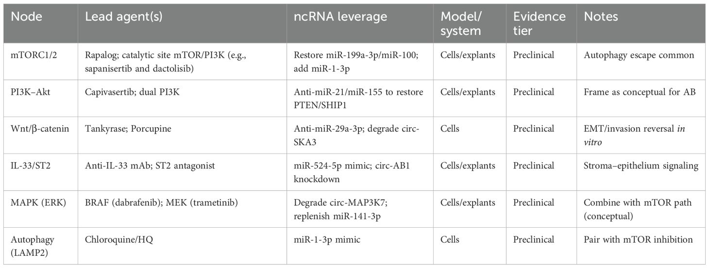Despite this, resistance remains a challenge. FGFR2-high clones can escape even dual PI3K/mTOR inhibition, with chronic Akt suppression inducing FGFR2 upregulation and activating STAT3. Preliminary studies have suggested that JAK1/2 inhibitors or a targeted FGFR2 blockade, administered in a rotating trimodal regimen, may prevent clonal expansion. The most promising strategy now under investigation involves the integration of ncRNA reprogramming—restoring miR-199a-3p, miR-100, and miR-1-3p while silencing miR-21, miR-29a-3p, and miR-155—with vertical kinase inhibition and intermittent autophagy suppression. These regimens are currently being evaluated in patient-derived organoid models and, if successful, may offer the first real therapeutic alternative to facially disfiguring surgery for high-risk ameloblastoma (46, 47) (Table 3).