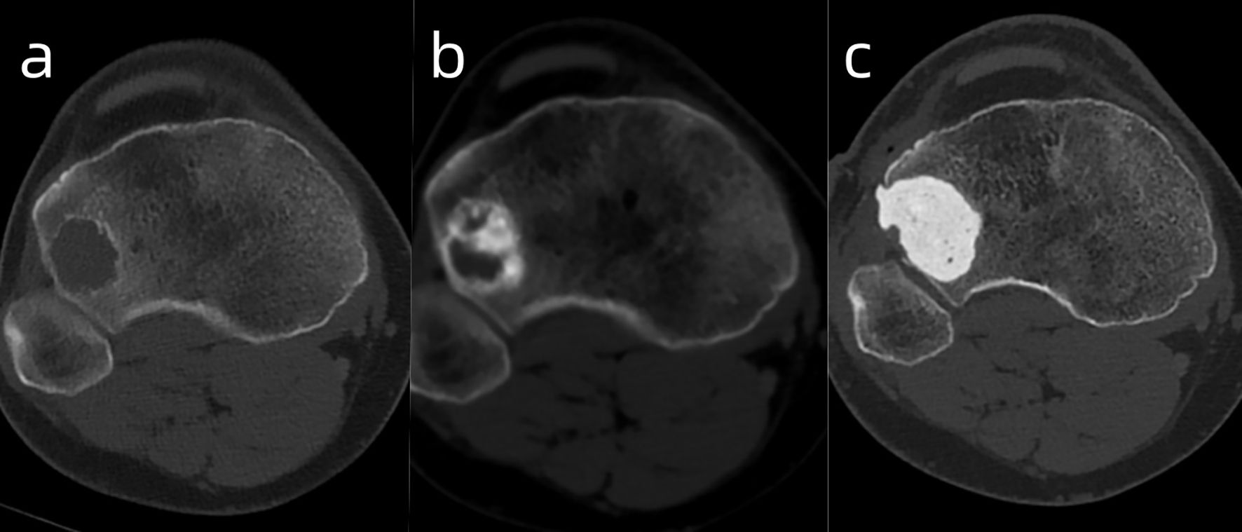 The patient was admitted to our hospital on April 11, 2024. A CT scan revealed a new giant cell tumor of the right proximal tibia (The third site)(Figure 2a). Surgical treatment was recommended; however, due to psychological fear of surgery, the patient was instead treated with denosumab (120 mg on Day 1, Day 8, and Day 15 of the first month, followed by one injection every 28 days, for a total of 12 injections).