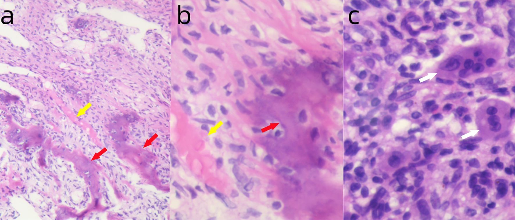 Figure 3. (a) Postoperative pathology showing fibrous tissue hyperplasia (yellow arrow) and new woven bone formation (red arrow). H&E ×100. (b) Higher magnification showing fibrous tissue hyperplasia (yellow arrow) and new woven bone formation (red arrow). H&E ×400. (c) Small foci of multinucleated giant cell infiltration (white arrow). H&E ×400.