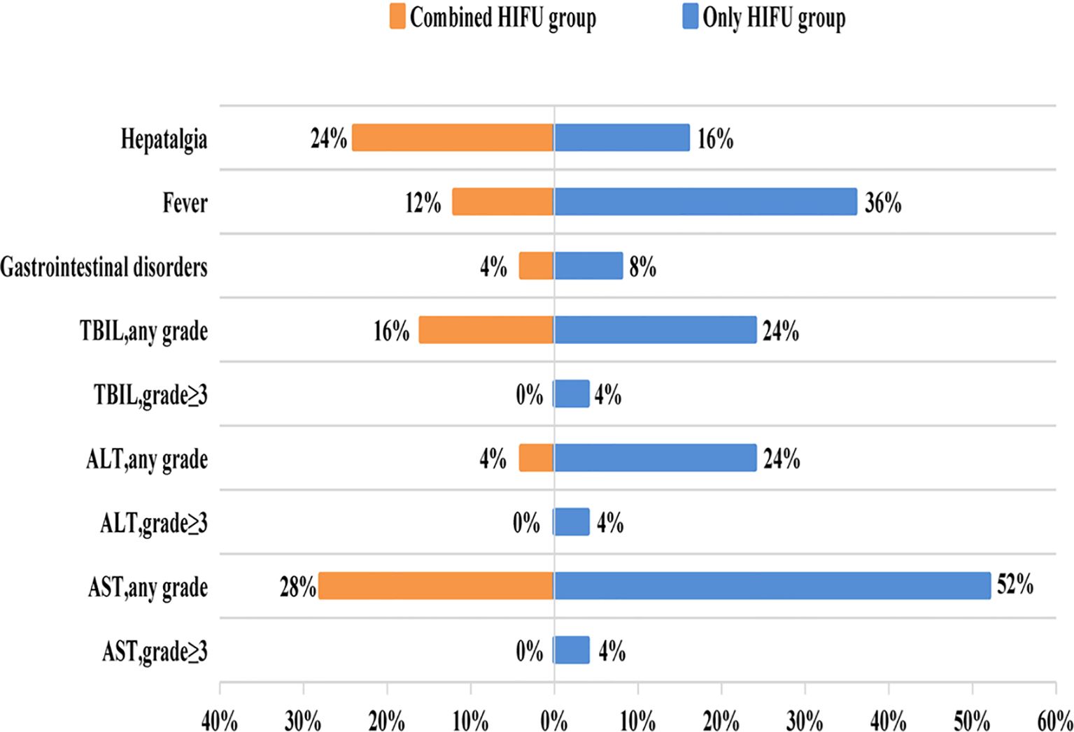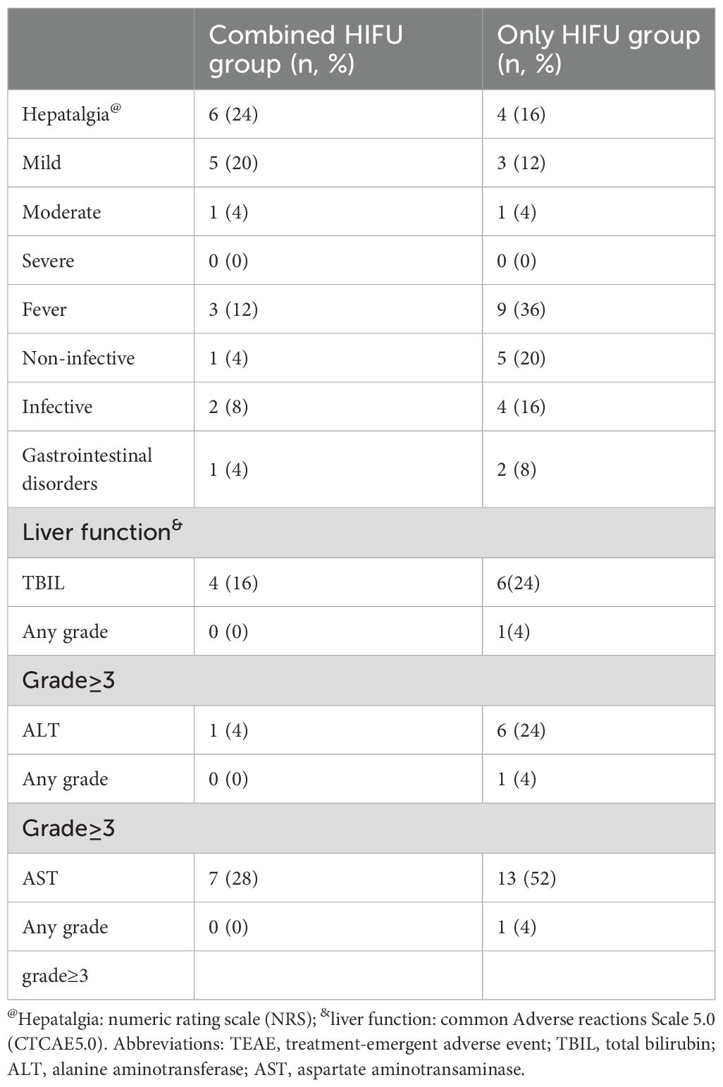 No skin infection, tumor rupture, hemorrhage, or organ perforation occurred in either group. 20% (10/50) of patients developed hepatalgia and mild to moderate burning pain on the skin, with no patients experiencing severe pain. Mild pain was relieved after treatment with ice and non-steroidal anti-inflammatory drugs, and moderate pain in two patients was alleviated after treatment with weak opioid painkillers and ice. 24% (12/50) of patients were febrile within 3 days after the operation, largely due to bile duct infection and sepsis, with the incidence of fever being 3 times in the Only HIFU group compared with the Combined HIFU group. All liver function injuries occurred within 24h after HIFU, with most of them being transient and resolving without treatment. Notably, no patients developed grade 3 or higher liver damage in the Combined HIFU group, whereas 12% developed grade 3 or higher liver damage in the Only HIFU group (Table 4, Figure 3).