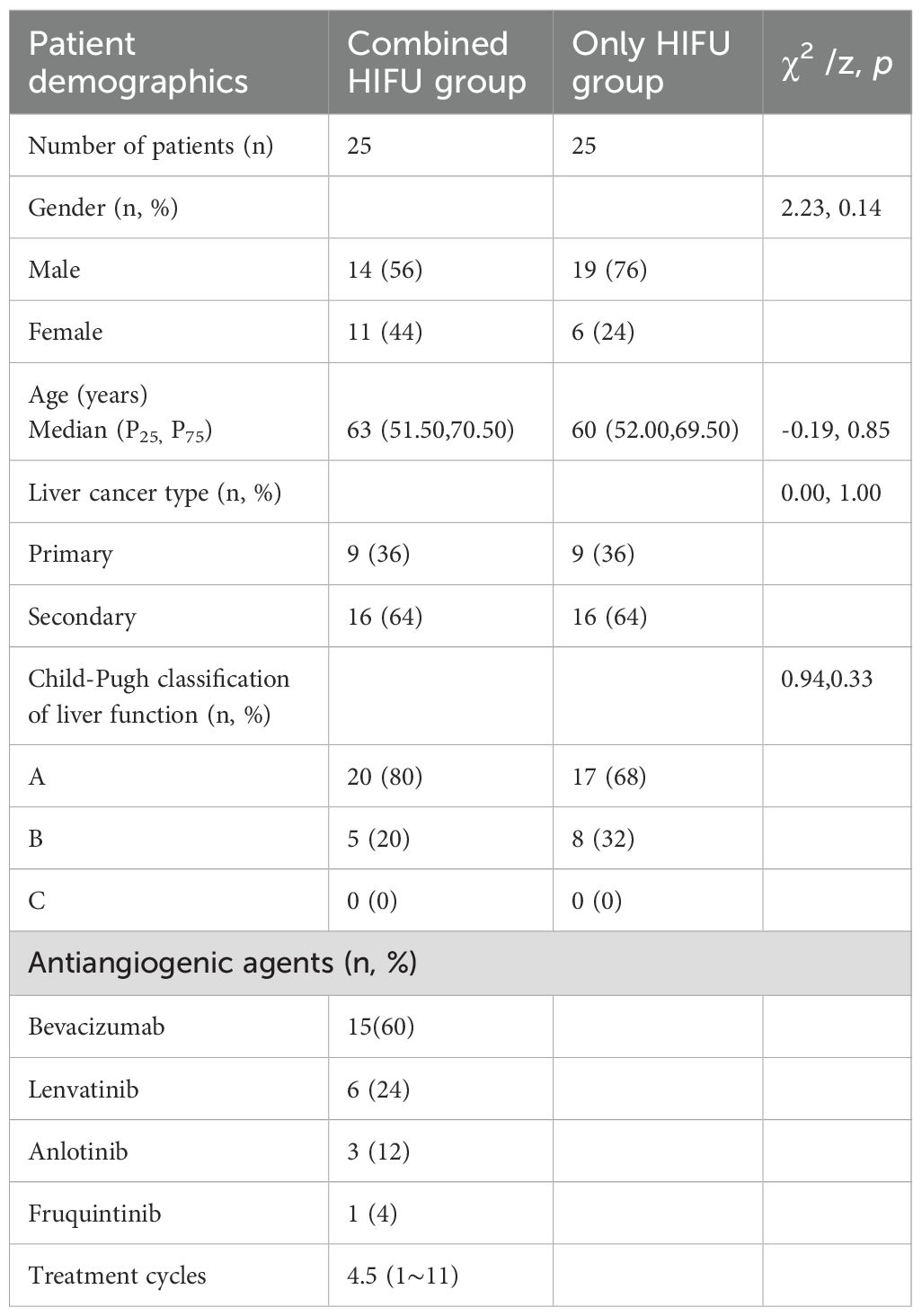 Magnetic resonance imaging (MRI) and ultrasound imaging (US) are currently the two mainstream modalities for guiding and monitoring clinical HIFU surgery, providing integrated treatment planning, real-time control (spatial and temperature), and evaluation (39, 40). Although MRI is highly sensitive to temperature and soft tissue contrast, it does not meet real-time imaging requirements during treatment and is costly, especially due to a lack of specialized MRI-HIFU equipment for liver cancer (41, 42). Ultrasound image-guided HIFU (US-HIFU) is the most widely used technique in the clinical setting owing to its low cost, favorable compatibility, and real-time performance (43). Thus, US-HIFU was used in this study. According to the HIFU treatment parameters in this study, a statistical difference was identified in the occurrence time of grayscale between the combined HIFU treatment group and the single HIFU group (p=0.04). The median grayscale occurrence time of the former was significantly shorter than that of the latter, signaling that advanced liver cancer treated with antiangiogenic agents was more sensitive to lesions and had a faster onset of effect during HIFU surgery. The grayscale of an ultrasound image is determined by the ultrasonic reflection coefficient of tissues (i.e., the intensity of reflected signals). In normal tissues, the cellular structure, density, and water content are relatively uniform, resulting in a stable reflection coefficient. Accordingly, the grayscale presents as uniform “isoechoic” (echo intensity matching the surrounding normal tissue) or “hypoechoic” (echo intensity lower than the surrounding normal tissue).After HIFU treatment, however, the proteins in the target lesion undergo denaturation. This process leads to the disruption of cellular structures, an increase in tissue density, and the formation of irregular “coagulative necrosis foci”. The density difference between the treated lesion and the surrounding normal tissue is thereby significantly enlarged, which enhances the ultrasonic reflection signals—causing the treated area to appear “hyperechoic” (echo intensity higher than the surrounding normal tissue) on ultrasound images. Therefore, the real-time monitoring of HIFU treatment efficacy can be achieved by tracking changes in ultrasonic grayscale (44).Although the irradiation time was not statistically different between the two groups, the median treatment volume in the combined HIFU group was 1 cc larger than that in the control group. Larger volumes are typically correlated with longer irradiation times. Therefore, while the total operation time was similar, larger lesions were simultaneously treated, which partially enhanced treatment efficiency, accelerated procedural workflow, and lowered the risk of intraoperative anesthesia. HIFU enables the selective destruction of tumor blood vessels with a diameter of ≤ 2 mm, while sparing major blood vessels. This mechanism blocks the nutritional supply to tumor cells, leading to their ischemic necrosis, without inducing the dissemination or metastasis of tumor cells (45).Additional studies have demonstrated that tumor vascular structure components including elastic fiber, endothelial cells all were destroyed by HIFU. After ultrasonic ablation, gray-scale of tumor nodules enhanced in ultrasonography, tumor peripheral and internal blood flow signals disappeared or significantly reduced in color Doppler flow imaging (46). In advanced liver cancer, tumors exhibit abundant blood flow and high perfusion. The heat generated by HIFU is easily dissipated by the bloodstream, leading to insufficient temperature elevation in the tumor target region. As a result, the critical threshold of an instantaneous high temperature (over 60 °C),which is required to achieve one-time coagulative necrosis, and cannot be reached rapidly. This ultimately results in limited therapeutic efficacy and prolonged treatment duration. In the present study, antiangiogenic targeted drugs are administered prior to HIFU therapy to inhibit tumor blood supply and reduce blood flow. This intervention transforms the target lesion from a hypervascular state to a hypovascular state, thereby enhancing treatment efficiency and achieving a synergistic anti-tumor effect. Currently, Some studies on HIFU combined with transcatheter arterial chemoembolization (TACE) or radiotherapy also hinges on this fundamental principle (47, 48).It is worth recognizing that this study failed to demonstrate statistical differences due to the small sample size. In the future, large randomized clinical trials are warranted to further evaluate the efficacy and safety of the combination of antiangiogenic agents with HIFU for patients with advanced liver cancer.
