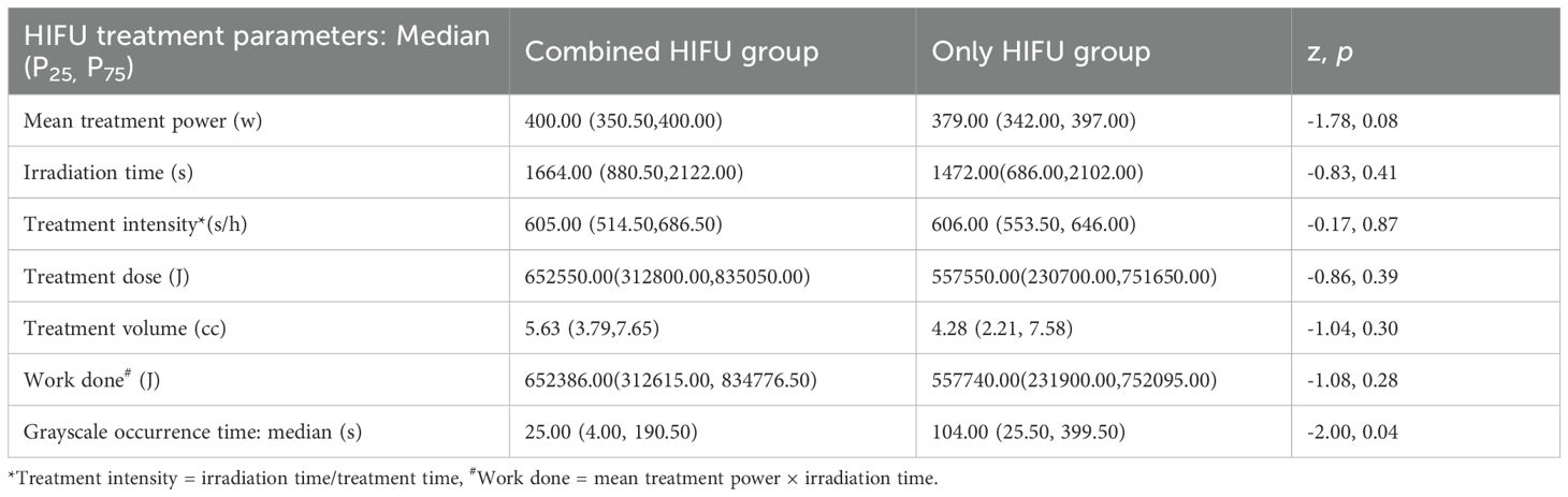 Patients were treated using a high-intensity focused ultrasound treatment system (Model: HIFU-JC200, Chongqing Haifu Medical Technology, Chongqing, China) equipped with a real-time ultrasound guidance device. The detailed information about the HIFU treatment is as follows.